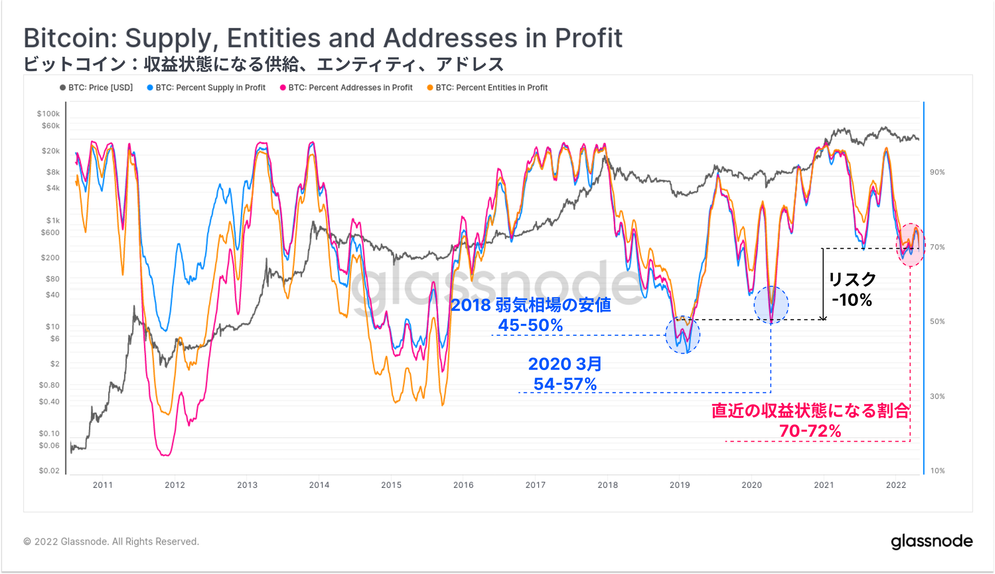 現在のアドレス、エンティティー、供給ともに含み益で保有している割合は70%前後で推移している(30%が含み損で保有しているという意味である)。2018~19年と2020年3月につけた過去の弱気相場の安値では、市場における収益性の低下ははるかに厳しく、45%~57%が含み益状態となっていた。