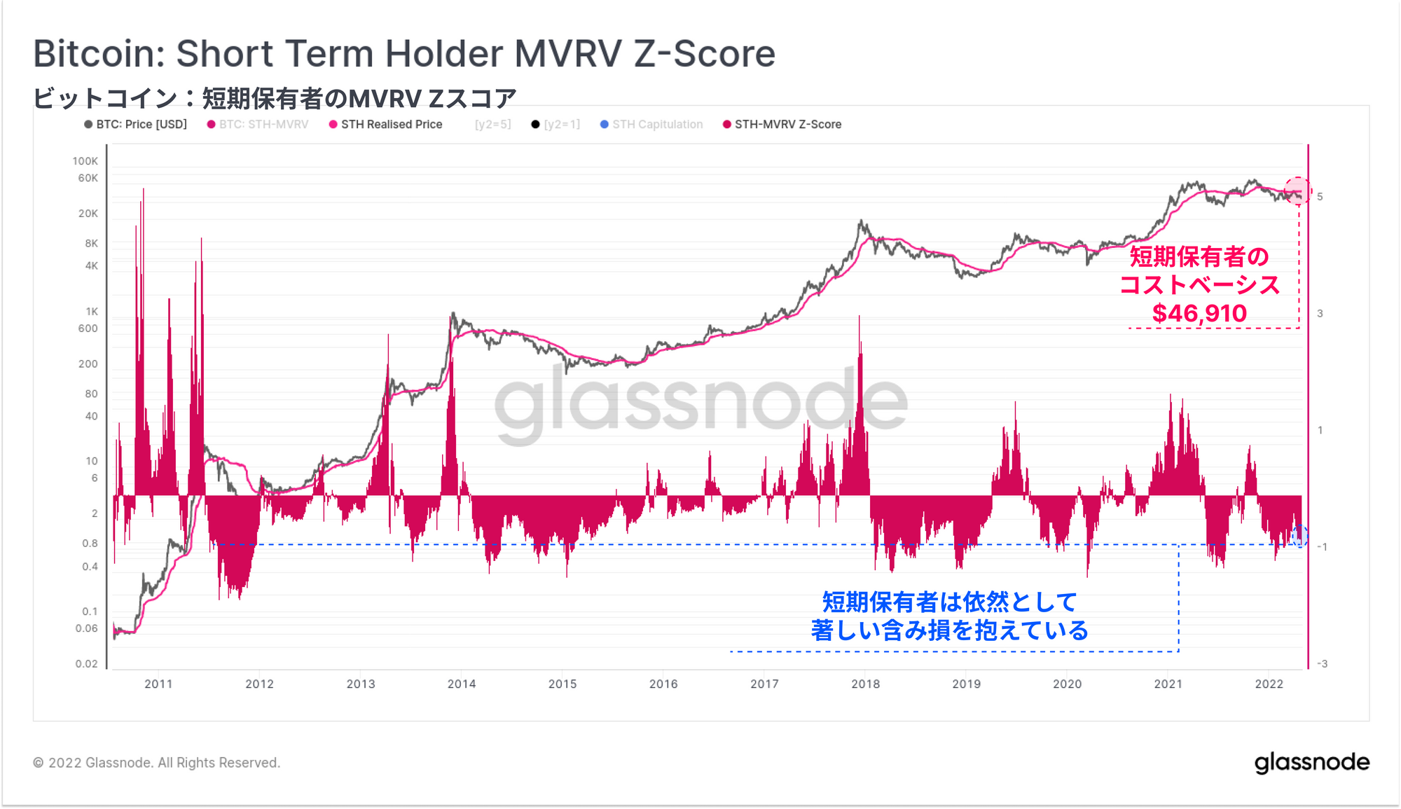 ・短期保有者の収益性がこれほど厳しいのは珍しいことではなく、弱気相場における最悪の売り込み時(オシレーターが青線より下にある時)にのみ典型的に見られるものである。
