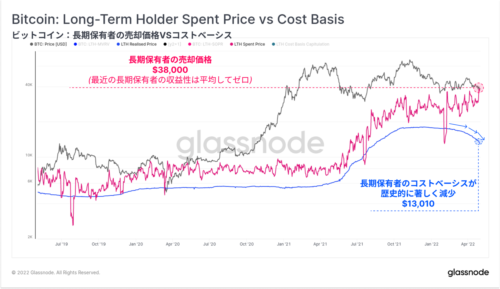 損失が発生し、この結果を引き起こす可能性のある長期保有者は、2021-22年サイクルのコストベースの高い長期保有者のみであり、現在は長期保有者が取引上への売却行為を支配していることが示唆される。