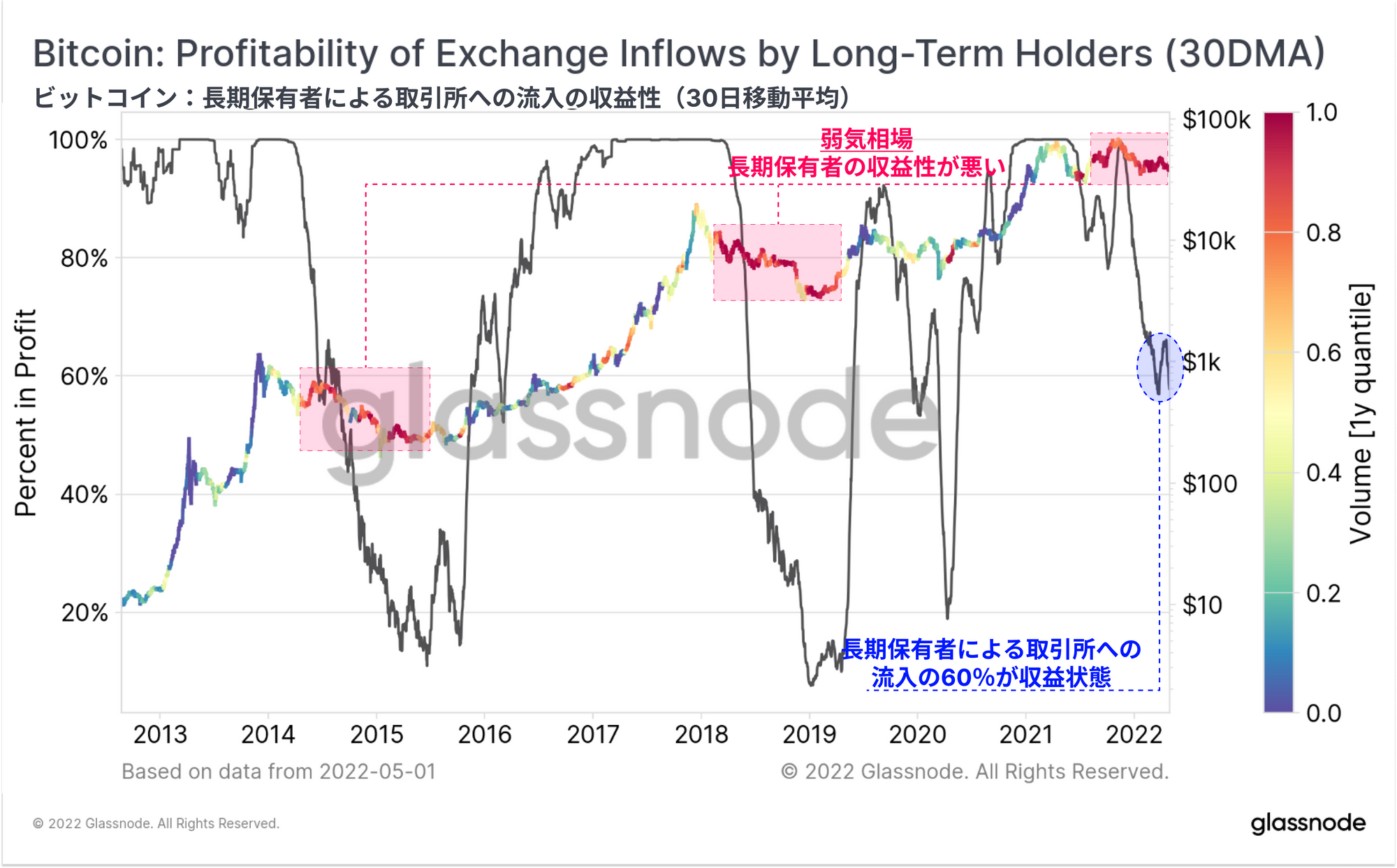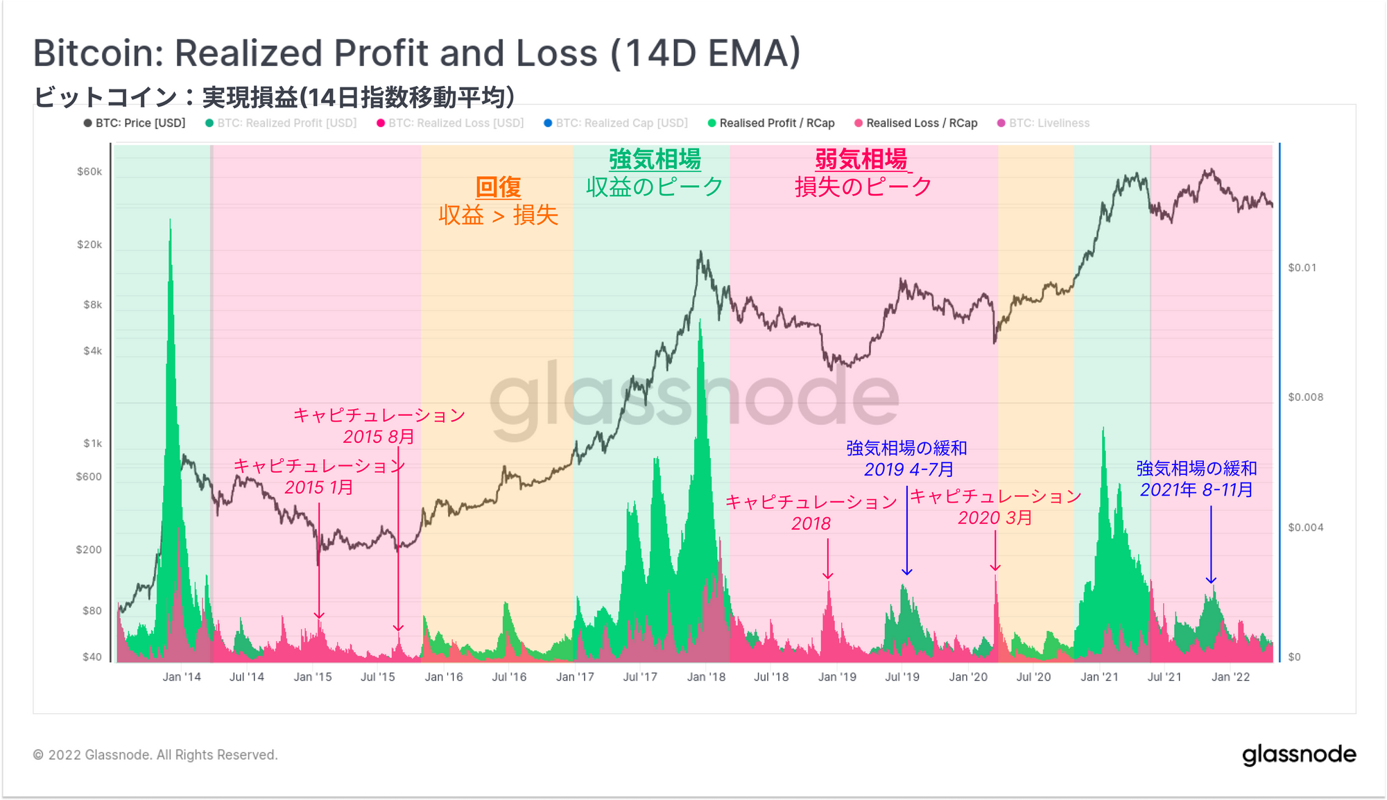 2、価格チャートは、過去1年間で比較した収益性で色分けされており、赤色は損失、緑/青色は収益を示している。2014-15年、2018-19年、2021-22年の弱気相場は非常に明白であり、長期保有者の大きな損失は何ヶ月にもわたって実現された。