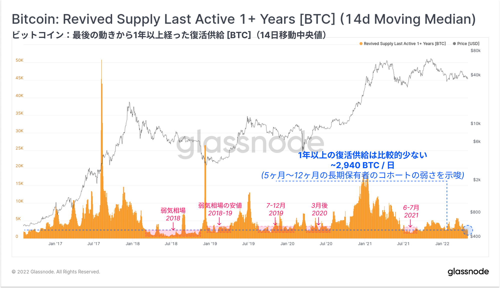 次に、2021年5月中旬の売り相場以前に購入されたすべてのBTCオンチェーンボリュームを捉えた1年越しの復活供給(Revived Supply 1yr+)を見てみよう。この指標は実際に減少しており、相対的な低水準に近いことがわかる。通常、復活供給における非常に低い測定値は、蓄積が長期保有者の好ましい行動となる深い弱気相場で発生する。
