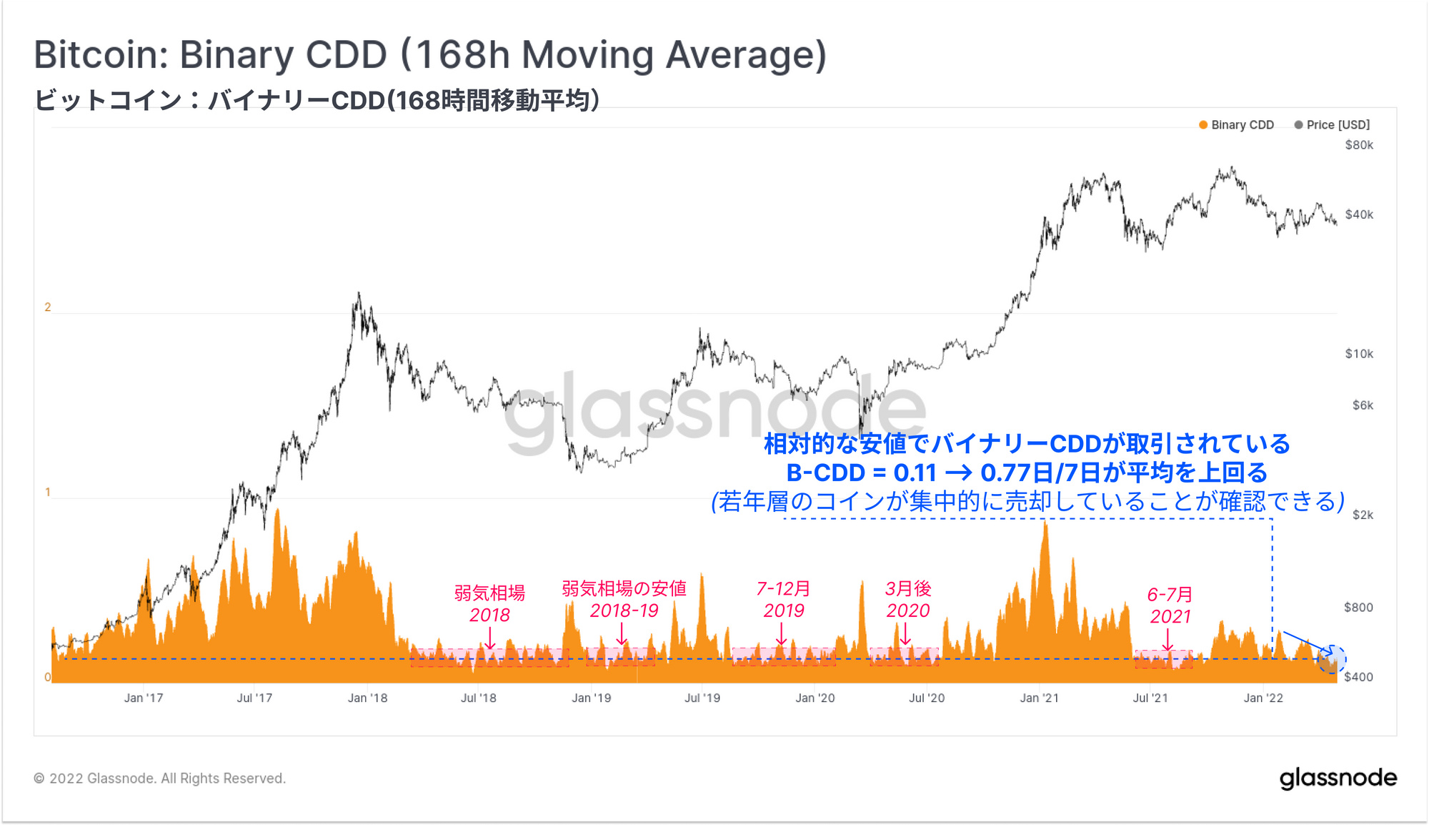 バイナリーコインデーの消滅(Binary Coin-days Destroyed)は、ほぼ同じトレンドと明らかな結果によって、この観測を大きく裏付けている。7日間平均(1時間単位)で見ると、この指標は、1週間のうち18.5時間が平均コインデー(平均寿命)よりCDDが多いことを示している。言い換えれば、古いコインの保有者は89%の時間、休眠状態を維持することを選択し、売り手側の圧力として加担していない。