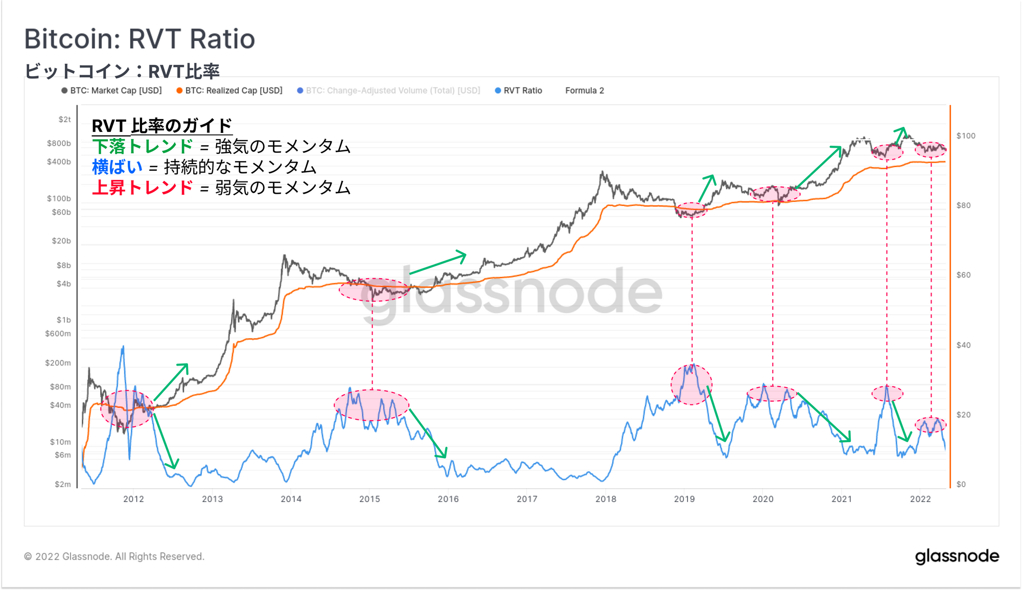 ・上昇トレンドとハイバリューは歴史的に弱気であり、取引高(したがってネットワークの利用率)がオンチェーン評価(過大評価)と比較して減少していることを示す。弱気市場の底値は通常、RVT値が30を超えたときにつけ、下降トレンドでの反転によって確認される。