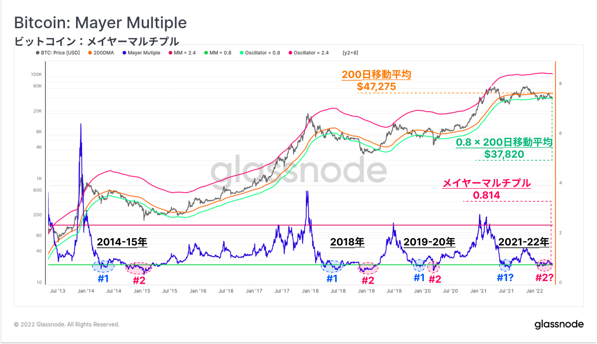 ここでは、歴史的な「過小評価」レベルとして0.8(緑色のトレース)のメイヤーマルチプルをマッピングしている。この根拠は、ビットコインの取引寿命の15%未満がこのレベルであった、またはそれ以下であったことによるものであり、より確率の高い見方を提供している。200日移動平均は47,275ドルであり、この20%のディスカウントレベルは現在取引されている37,820ドルである。