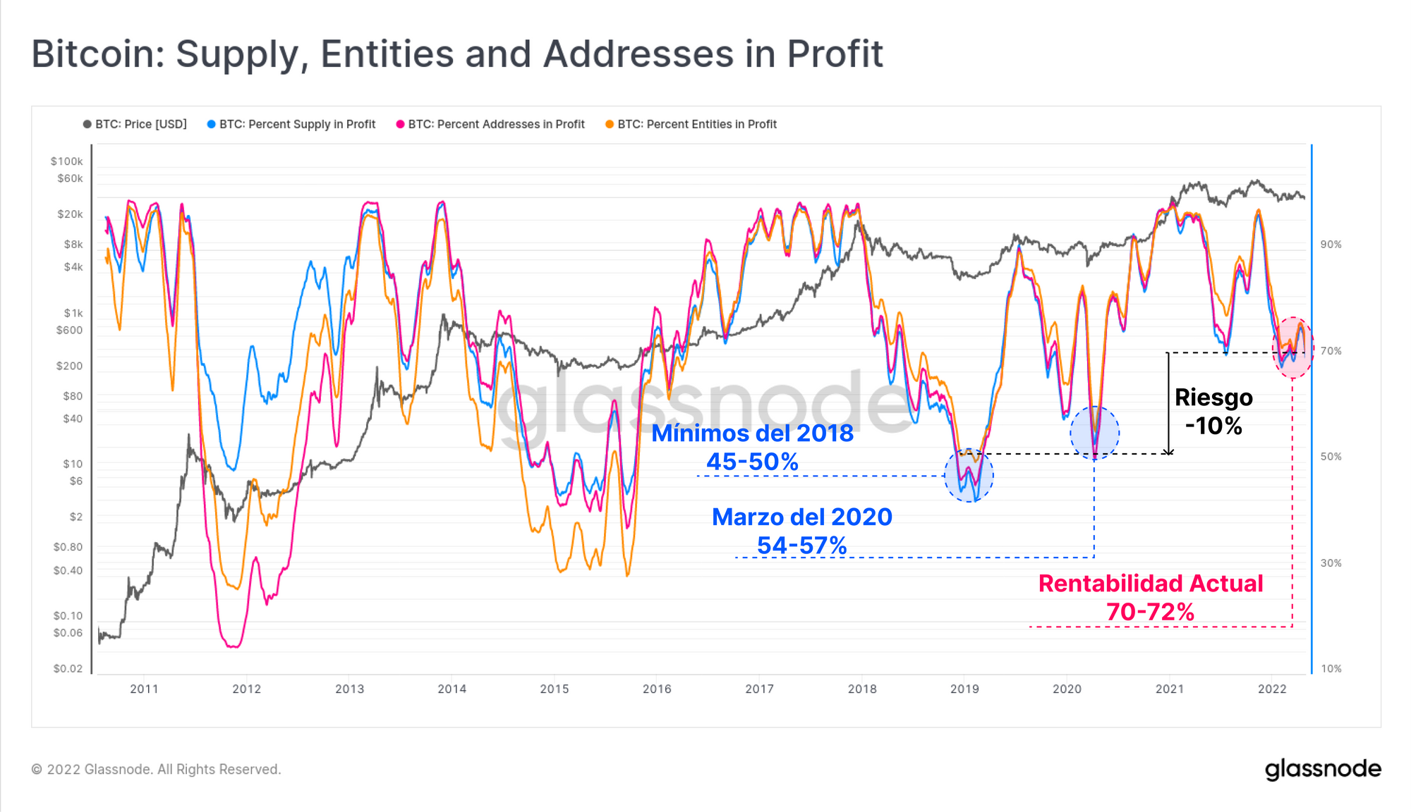 Actualmente, la proporción de Direcciones, Entidades, y Oferta que dan ganancias orbita alrededor del 70% (es decir un 30% está en pérdidas). Los mínimos que establecimos en los anteriores mercados bajistas del 2018-19, y marzo del 2020 nos dejaron declives de rentabilidad bastante más severos, con apenas entre el 45% y el 57% del mercado en ganancias.