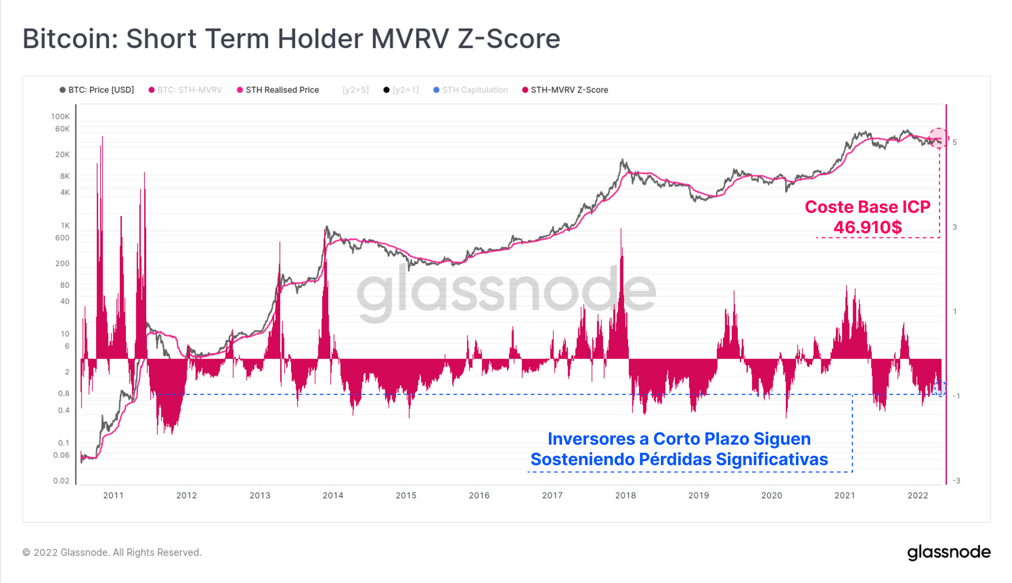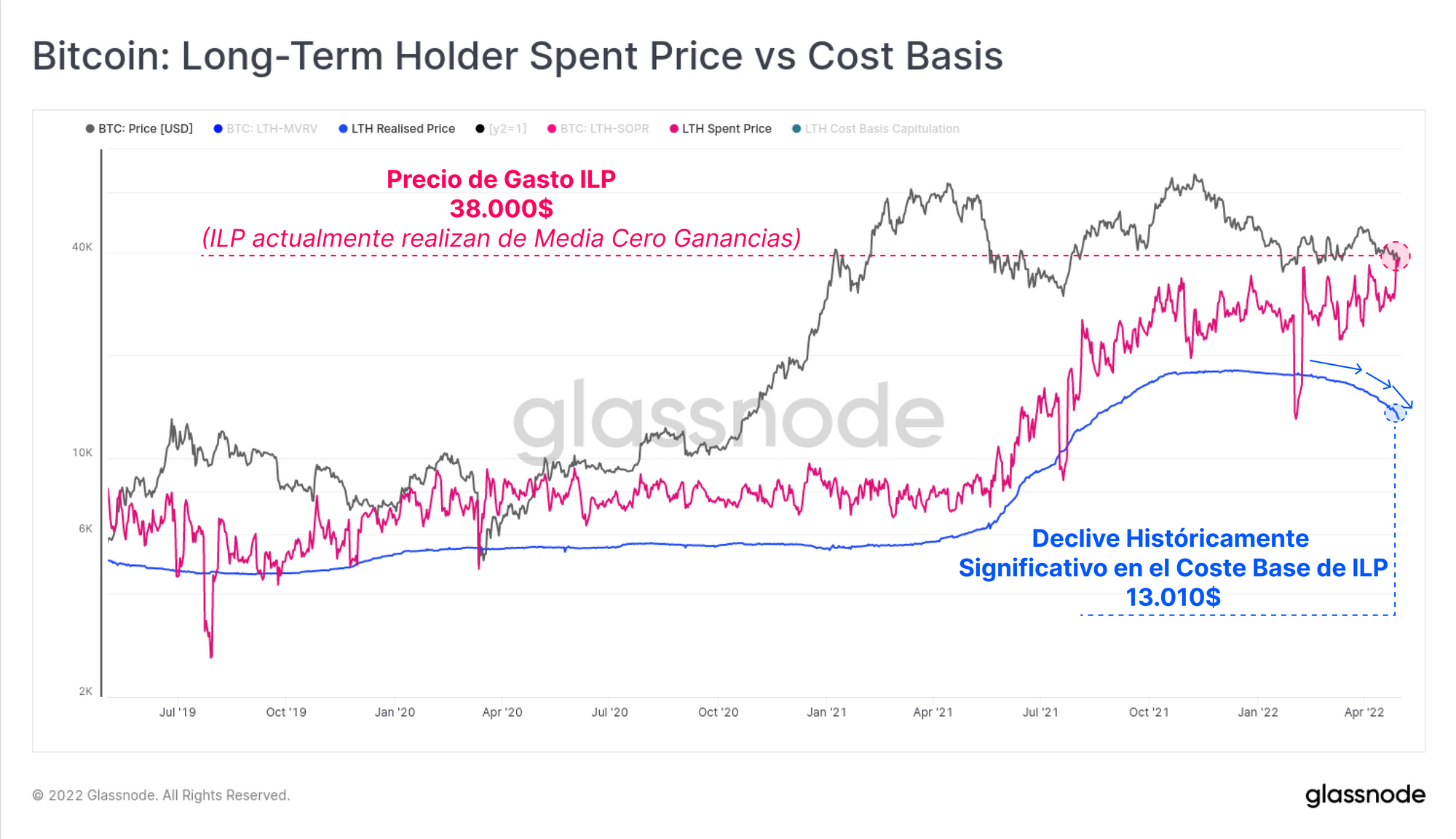 - El Precio de Gasto de los Inversores a Largo Plazo (rosa): Esta métrica muestra el precio medio de compra de las monedas que los ILP gastan ese día. Esta semana está ascendiendo considerablemente, alcanzando al precio de mercado, Indicando que los ILP están vendiendo en pánico a precio de compra de media.