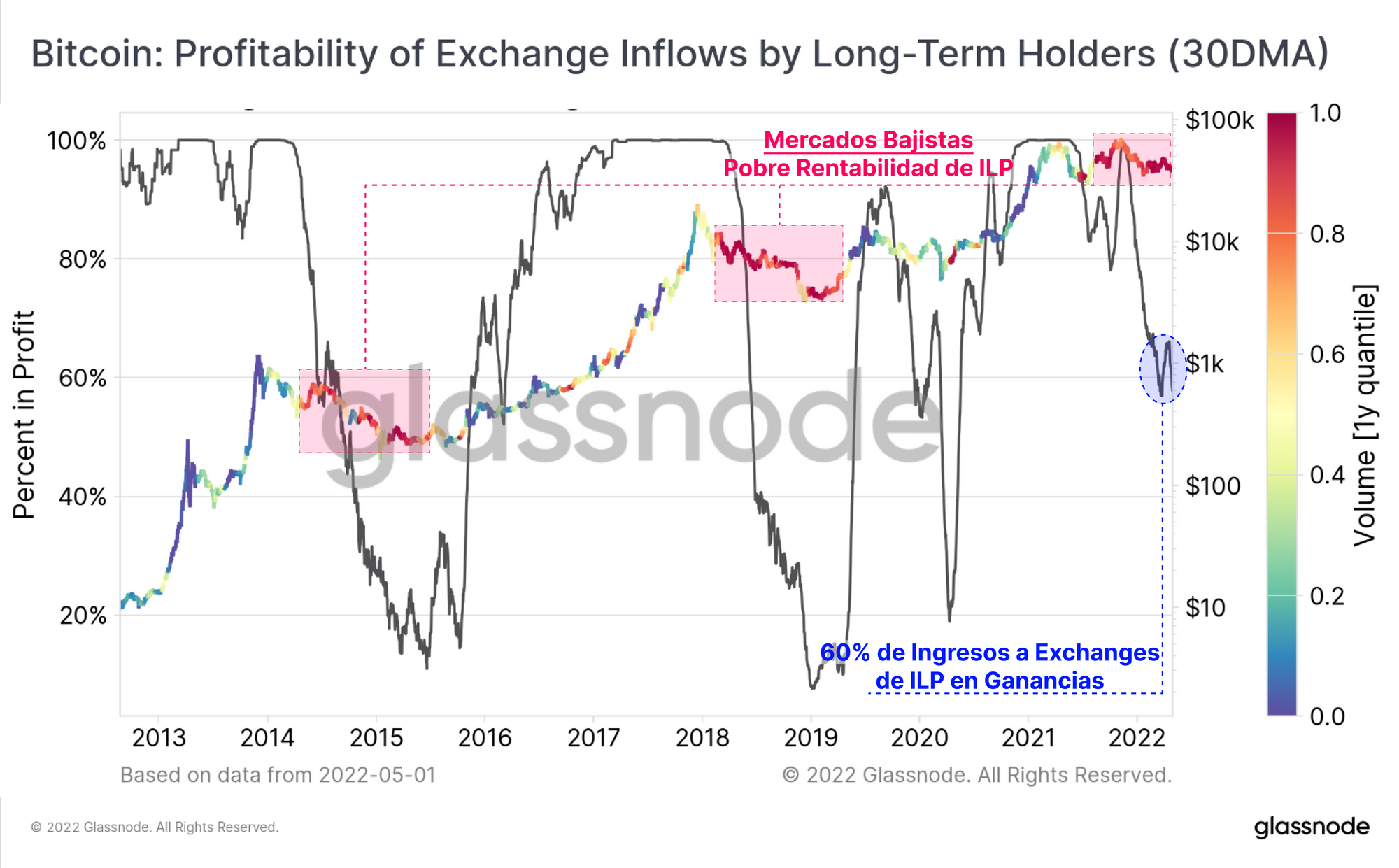 - Un oscilador (gris, Media Móvil Diaria de 30 periodos) que muestra la proporción de volumen de BTC en ganancias que los ILP envían a los exchanges. Se puede apreciar que ha disminuido sustancialmente desde septiembre del 2021, y ahora ronda el 60% (añadiendo peso a nuestra anterior estimación del ‘umbral del dolor’ del 60%).