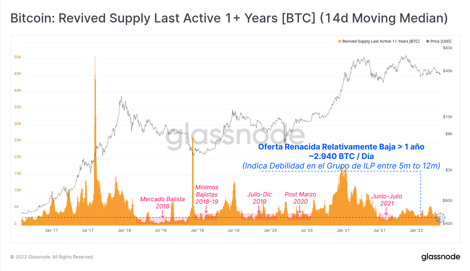 Para continuar nos vamos a centrar en la Oferta Renacida de +1 año de edad, la cual plasma todo el volumen de BTC del blockchain que se compró antes del desplome de mediados de mayo del 2021. Vemos que esta métrica está retrocediendo realmente y se sitúa de hecho en mínimos relativos. Normalmente se encuentran valores muy bajos de oferta renacida en las profundidades de los mercados bajistas cuando la acumulación se convierte en la opción a seguir de los ILP.
