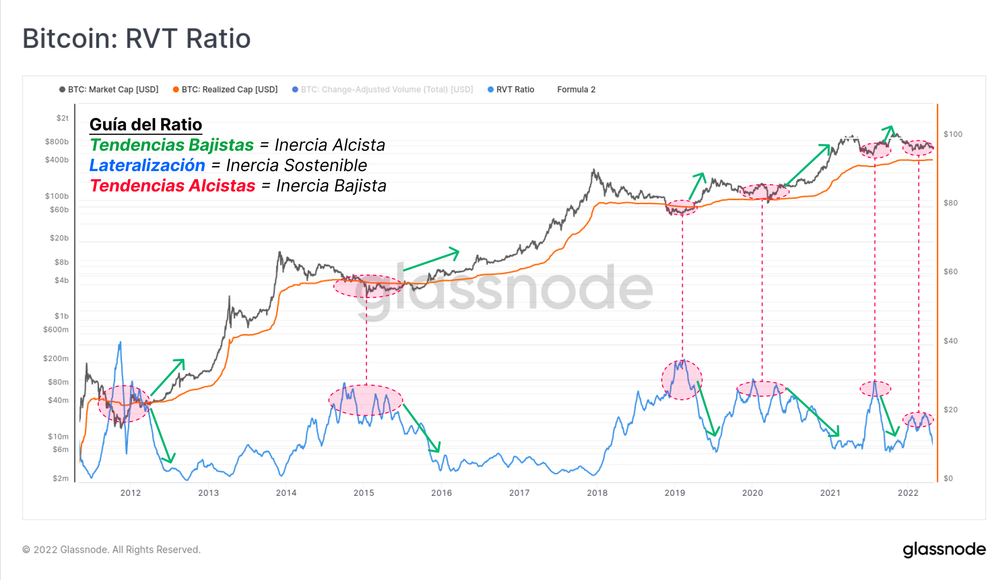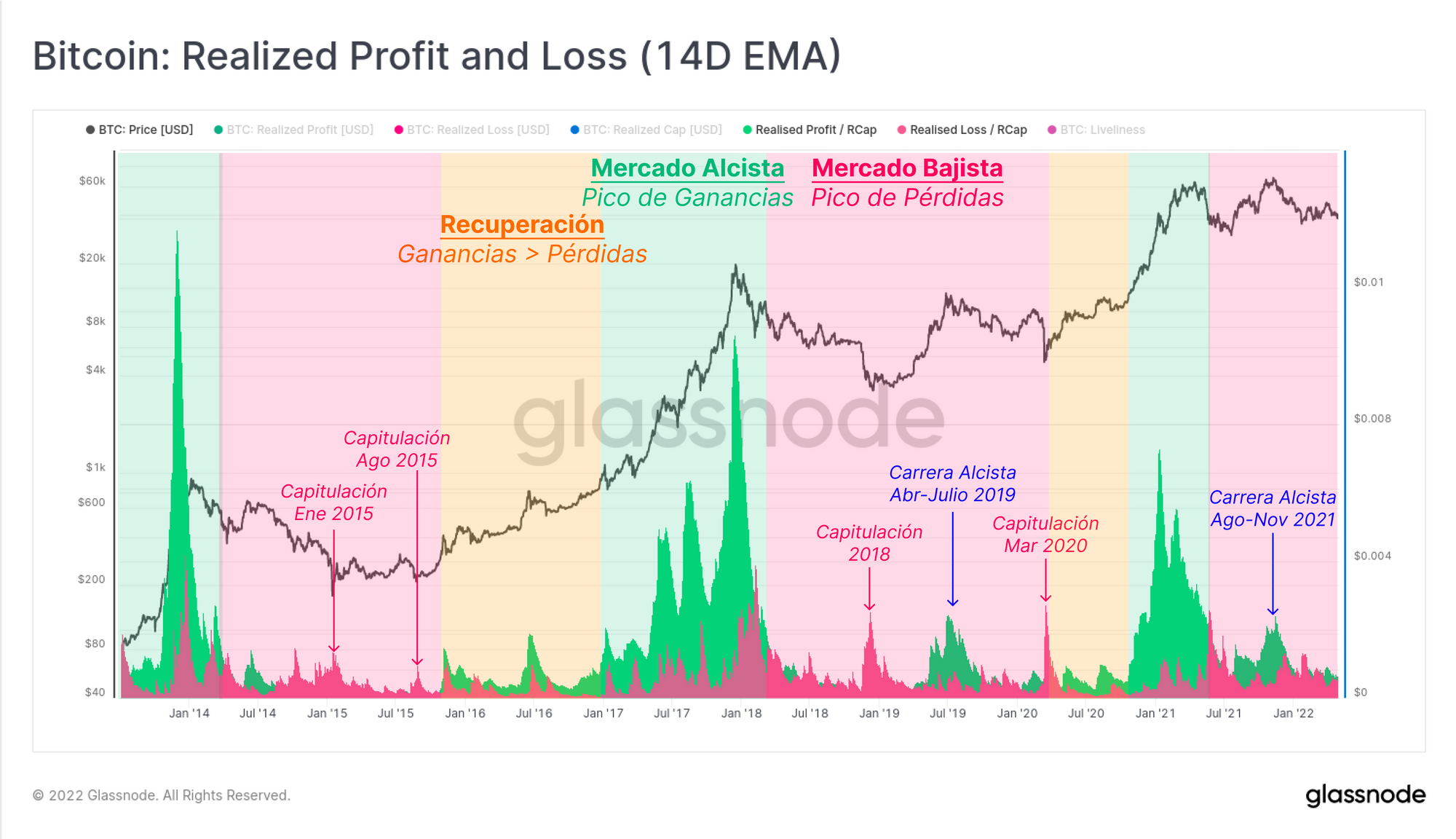 - Mercados Bajistas (zona roja), donde se cumple lo contrario, y las caídas en los precios provocan que predomine entre los inversores la realización de pérdidas (salida neta de capital). En el 2019 y presumiblemente a finales del 2021, vimos cómo se recogían beneficios durante las breves recuperaciones alcistas, hasta que terminaron por sobrevenderse.