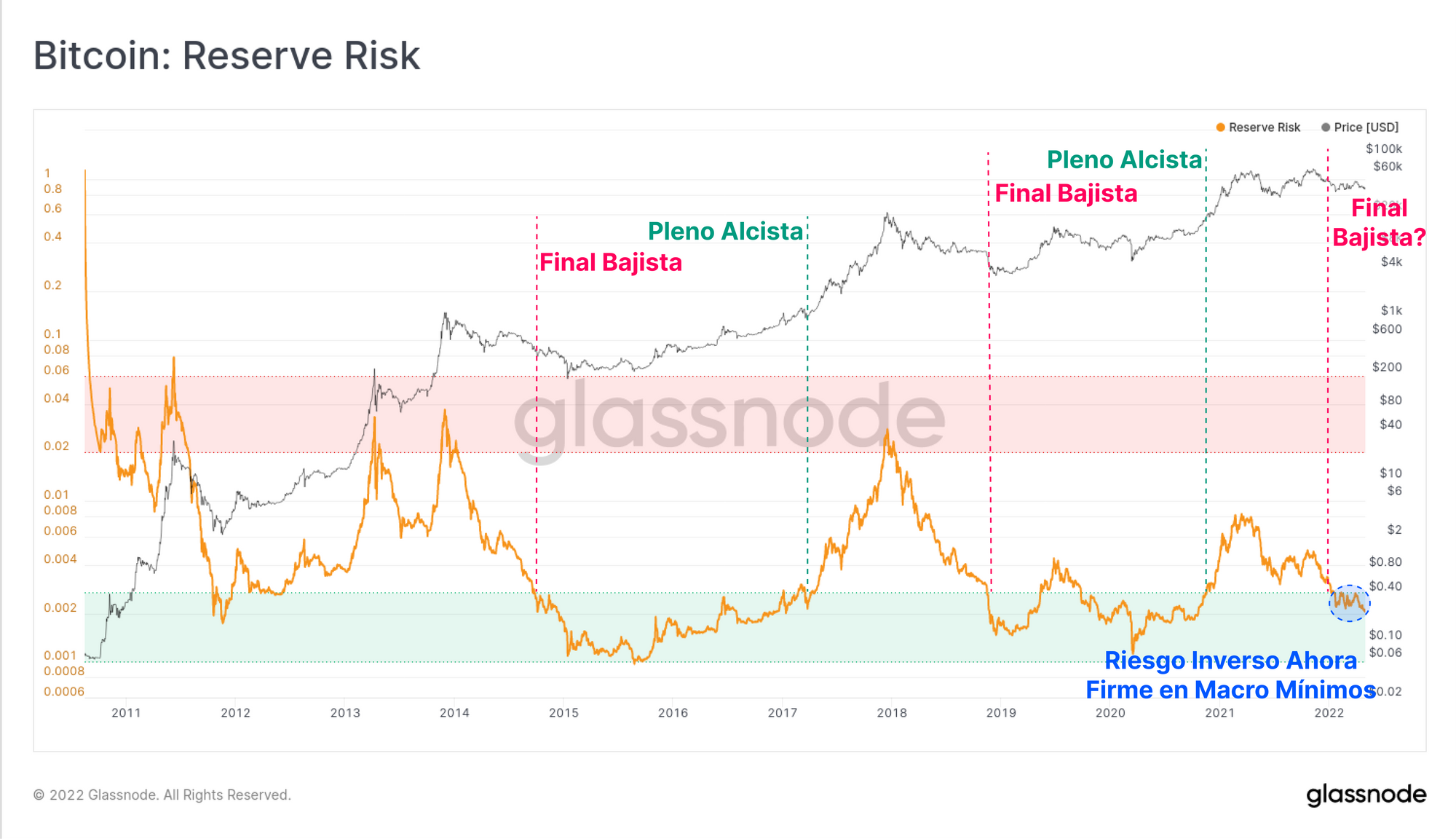 La métrica de Riesgo Inverso nos acerca otra macro perspectiva para encontrar suelos en mercados bajistas, y se trata de un oscilador altamente influenciado por las instancias en las que la acumulación a largo plazo es la estrategia favorita por excelencia. Históricamente, el Riesgo Inverso ha caído por debajo del 0,0025 (verde) durante los estadios finales de los mercados bajistas (formación pre-suelo), y resurgió ya comenzado el consiguiente mercado alcista.