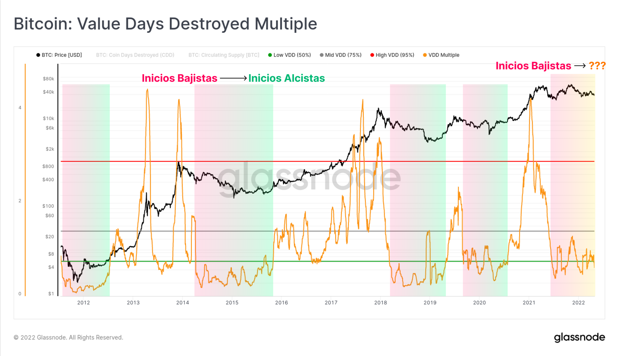 Los suelos de los mercados bajistas de los anteriores ciclos se han forjado típicamente en dos fases relativas al nivel del 0,8xMM, primero en los comienzos del periodo bajista (#1), y de nuevo tras un gran evento de capitulación (#2). El mercado está justo sobrevolando este nivel clave en lo que podría considerarse parte de la Fase 2 del ciclo 2021-22.