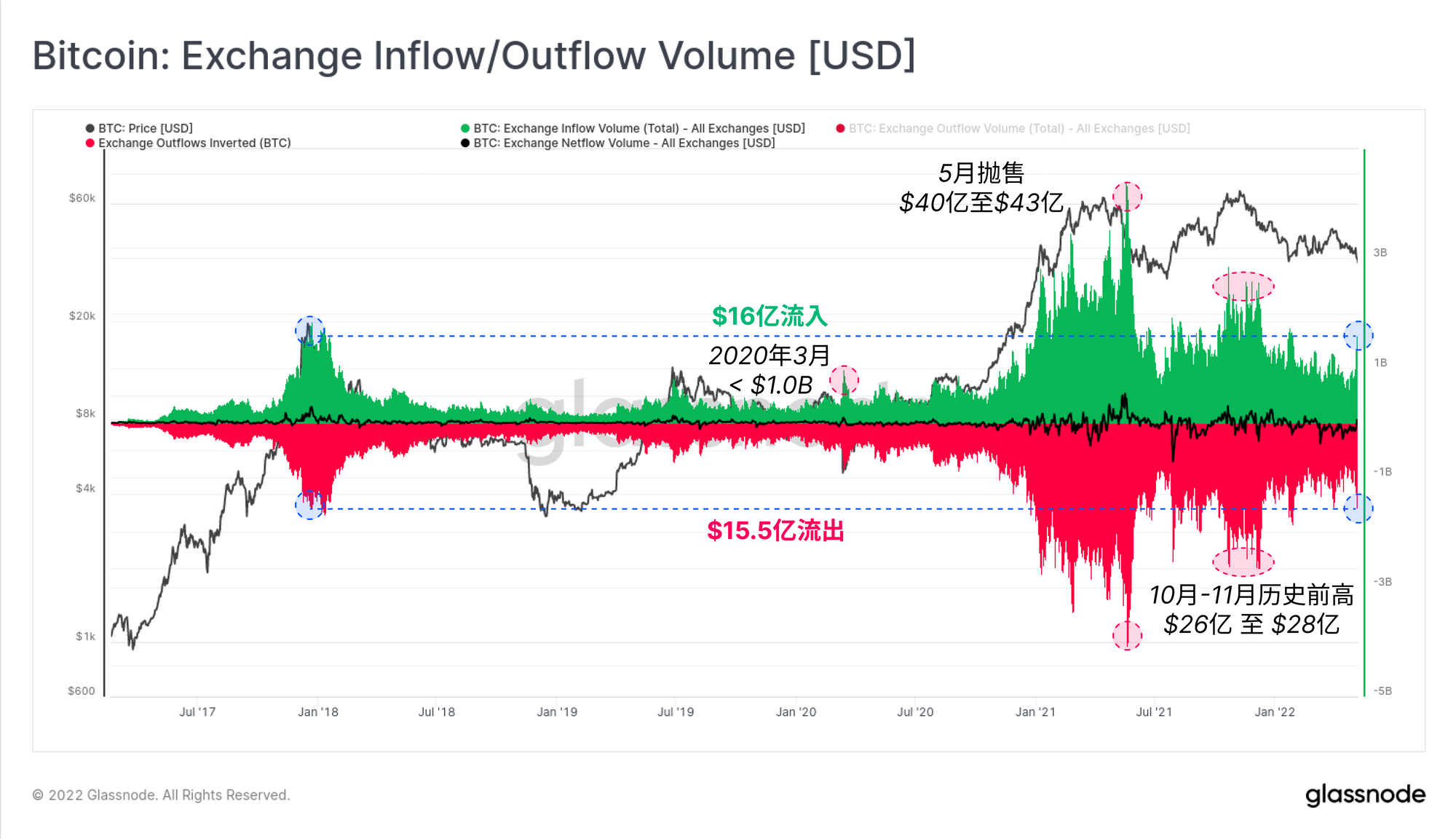 在任何一天,都有大量的BTC流入和流出交易所。交易所资金流量远远超过7.5亿美元(双向的,总共15亿美元以上),是2021-22年市场周期的一个典型下限。