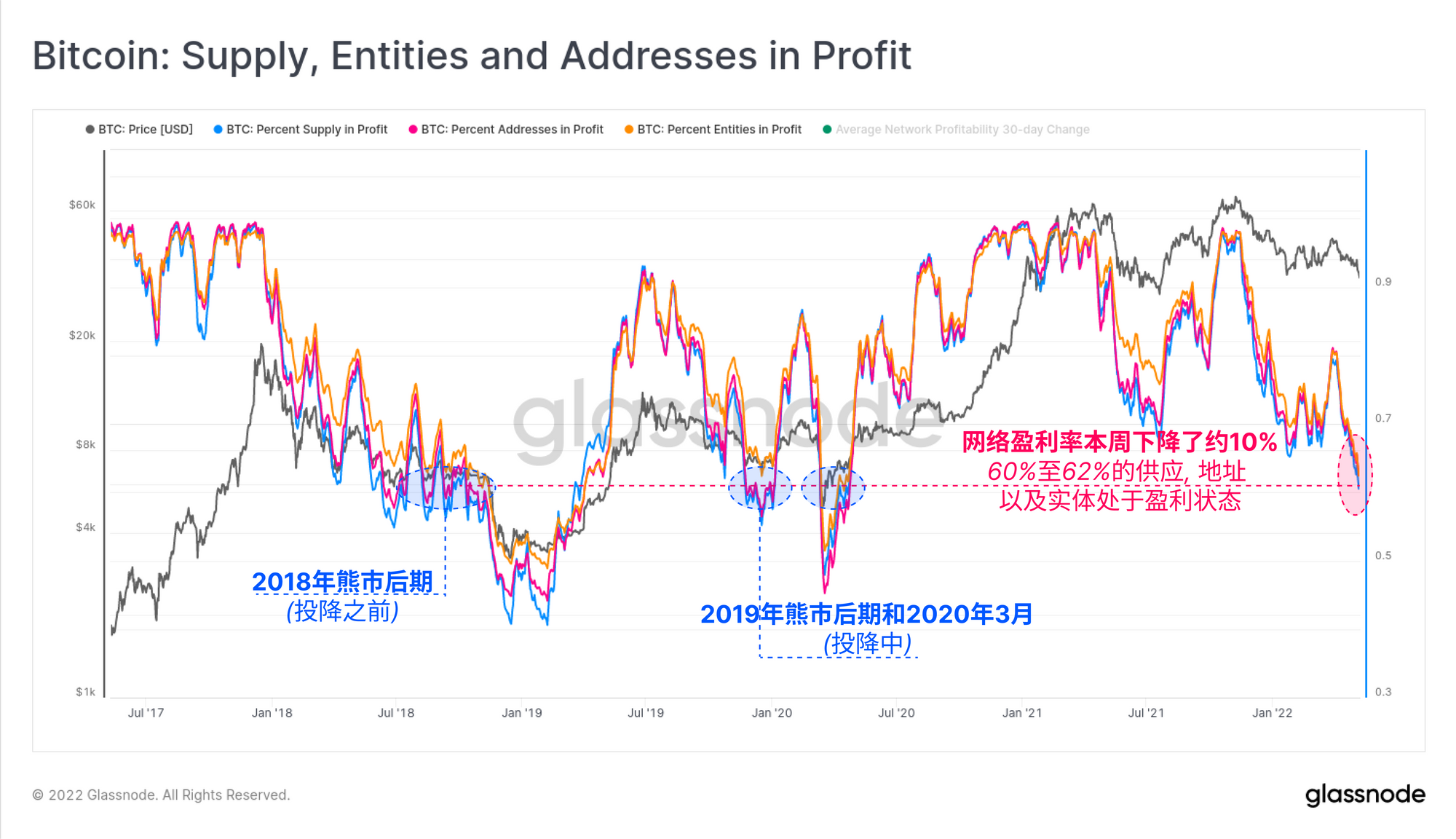 在上周的周报中,我们开展了一个潜在的案例研究,即整体网络盈利能力进一步下降10%(定义为地址、实体和/或供应的盈利百分比下降)。在该案例研究中,我们估计价格将需要下降到3.36万美元左右,以达到类似于以前熊市的 "痛苦阈值",并将整体盈利率下降到全网的60%左右。