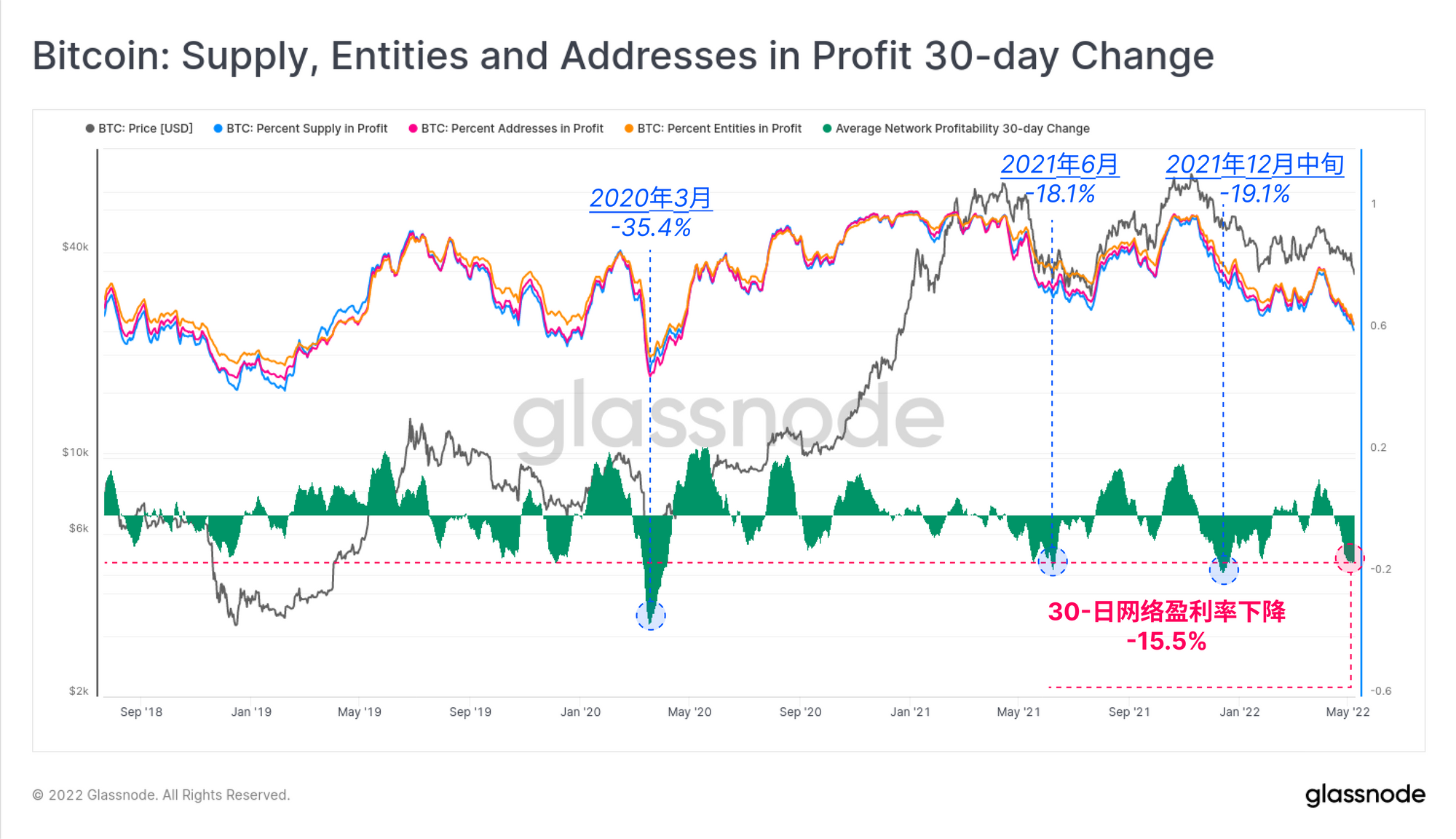 这种盈利能力的下降在过去3年中严重程度可以排到第四。与7月,和2021年12月相比,这两个月的全网盈利能力下降了-18.1%至-19.1%。2020年3月仍然是最近历史上最严重的下跌,在短短几天内,全网-35.4%的比特币陷入亏损。