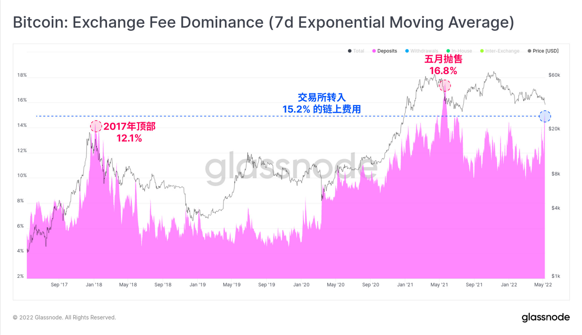在所有支付的链上交易费用中,有15.2%与交易所充值交易有关,这比2017年牛市的顶点(12.1%)更高,仅次于2021年5月的那次抛售(16.8%)。