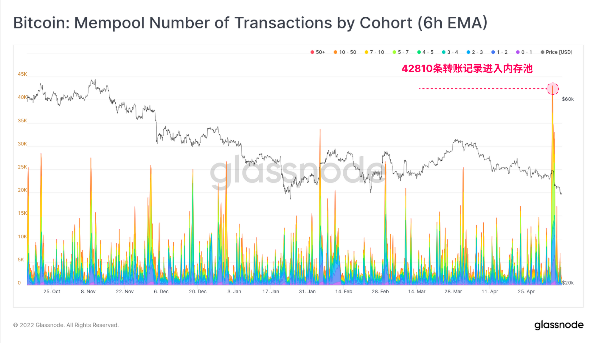 在市场波动和压力时期,通常会看到大量的 "紧急 "交易进入比特币内存池,因为投资者寻求降低风险、出售或重新抵押他们的保证金头寸。随着本周市场的抛售,我们确实看到有42.8万笔交易涌入比特币的mempool。这是自2021年10月中旬(我们开始跟踪mempool活动时)以来交易活动的最高涌入。