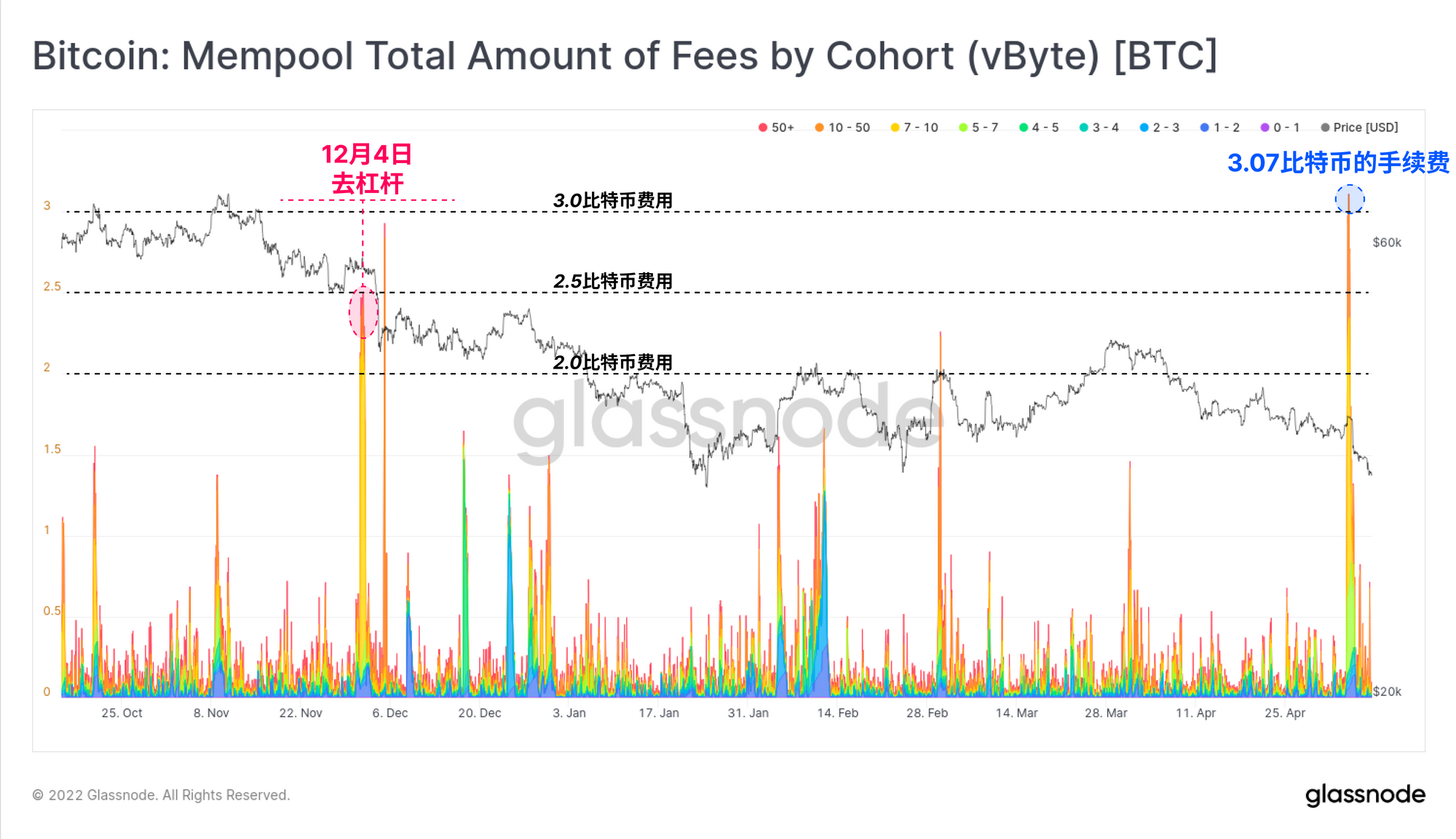 我们还发现,这些交易的紧迫性很高,因为支付的所有链上交易费用的总价值达到3.07枚BTC。这比去年12月4日的去杠杆化事件中的手续费更高,当时市场在一天内下跌了-34.5%(在第49周报道,2021年),而且这个手续费又是我们数据集中迄今收录的最大值。