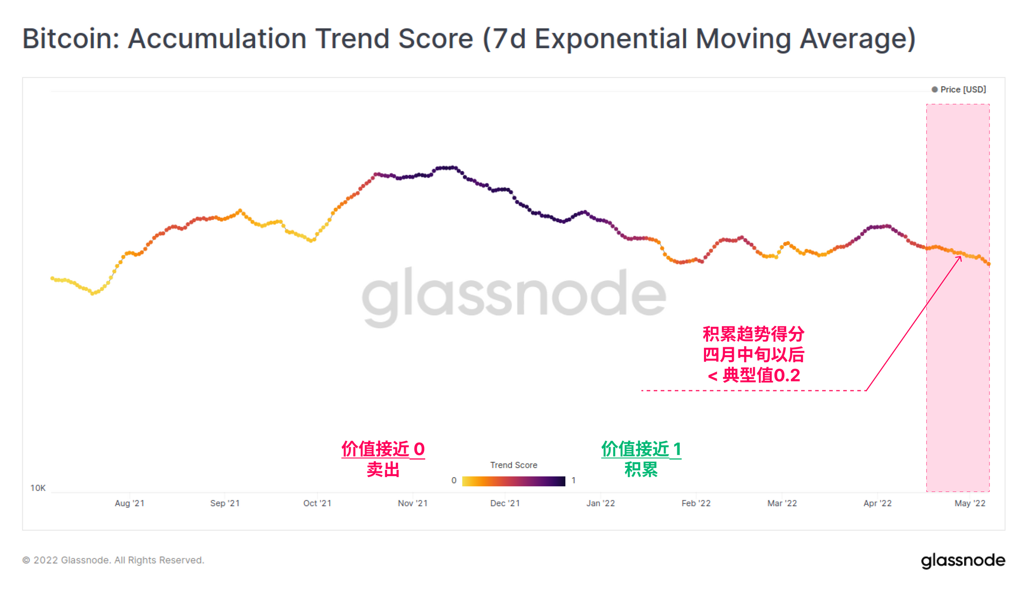 比特币积累趋势得分指标在本月明显疲软,自4月中旬以来持续下降,当前数值低于0.2。这通常预示着更多的卖出行为,更少的积累在发挥作用,并且与较弱的市场价格相吻合。