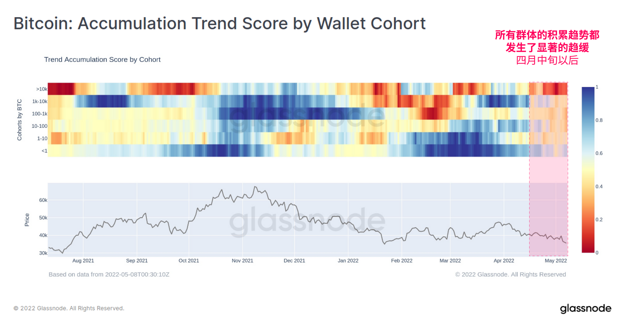 我们可以进一步将其分解为钱包群,我们看到从整体上看,从虾到鲸鱼的大多数钱包群,在其链上积累的趋势中大大软化了。在过去的几周里,余额大于1万的非常大的实体一直是一个特别重要的卖出力量,从返回的大红色数值可以看出。较小的投资者(<1BTC)是最强大的积累者,然而他们的积累明显比2月和3月的时候弱。