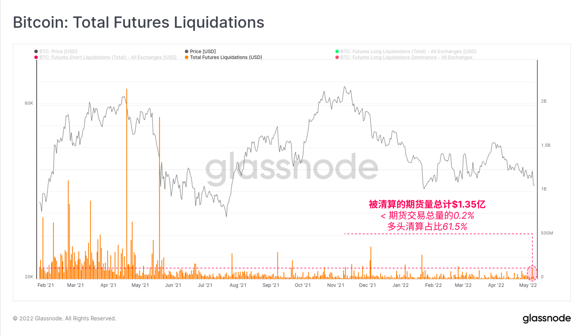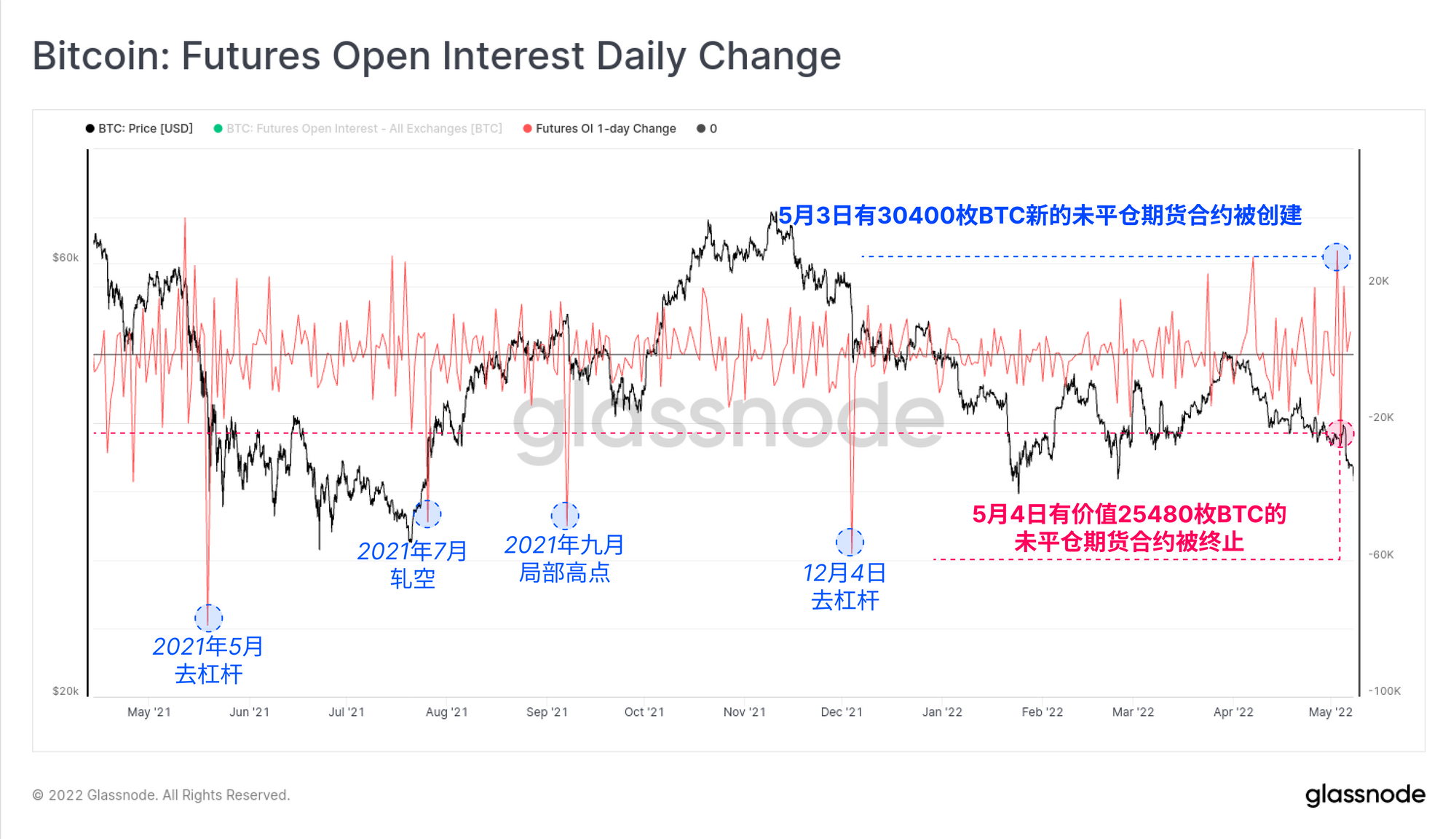 我们可以从期货未平仓合约的1天变化中看到美联储宣布加息前的最初鞭策行动。5月3日,未平仓合约总共增加了30400枚BTC,而在第二天,就有价值25480枚BTC的仓位被平仓。