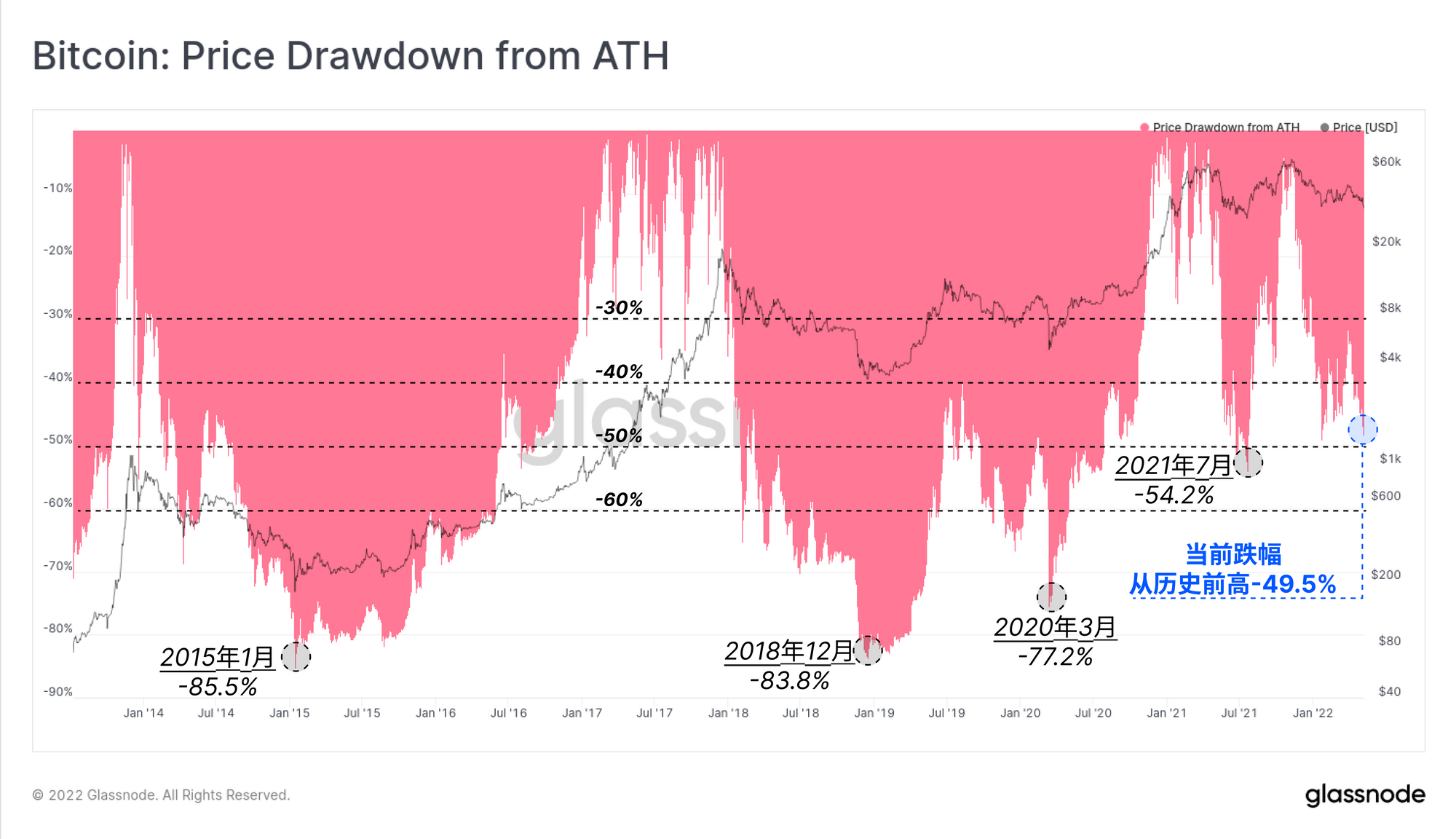虽然这代表了一个显著的下降,但与之前比特币熊市的最终低点相比,这个降幅仍然温和。2021年7月达到了-54.2%的跌幅,而2015年、2018年和2020年3月的熊市的下跌幅度达到历史前高的-77.2%和-85.5%之间的低点。