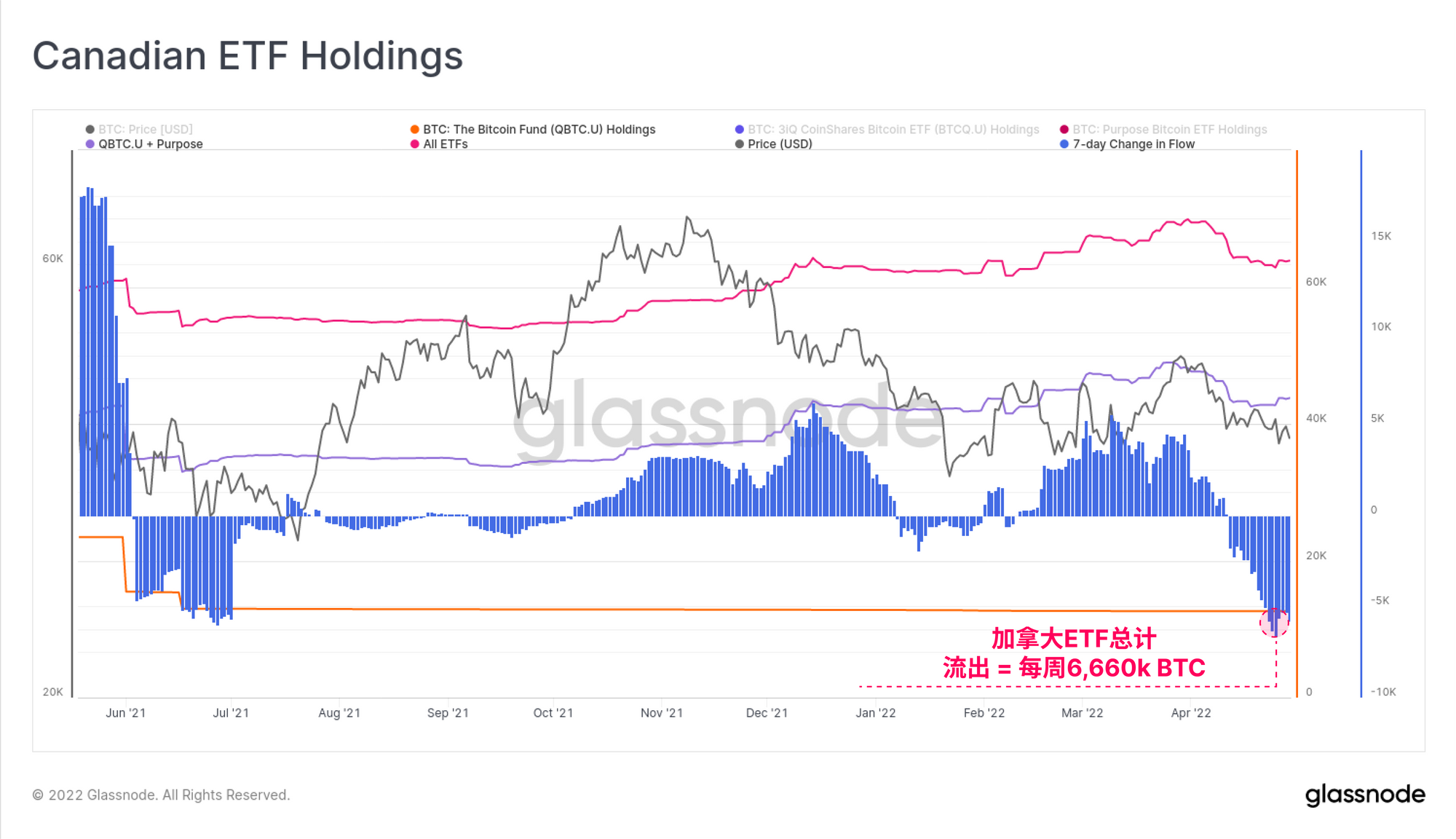 在7日变化线上,每周有超过6660枚BTC从这些工具中流出,这在很大程度上对应了最近的价格疲软。