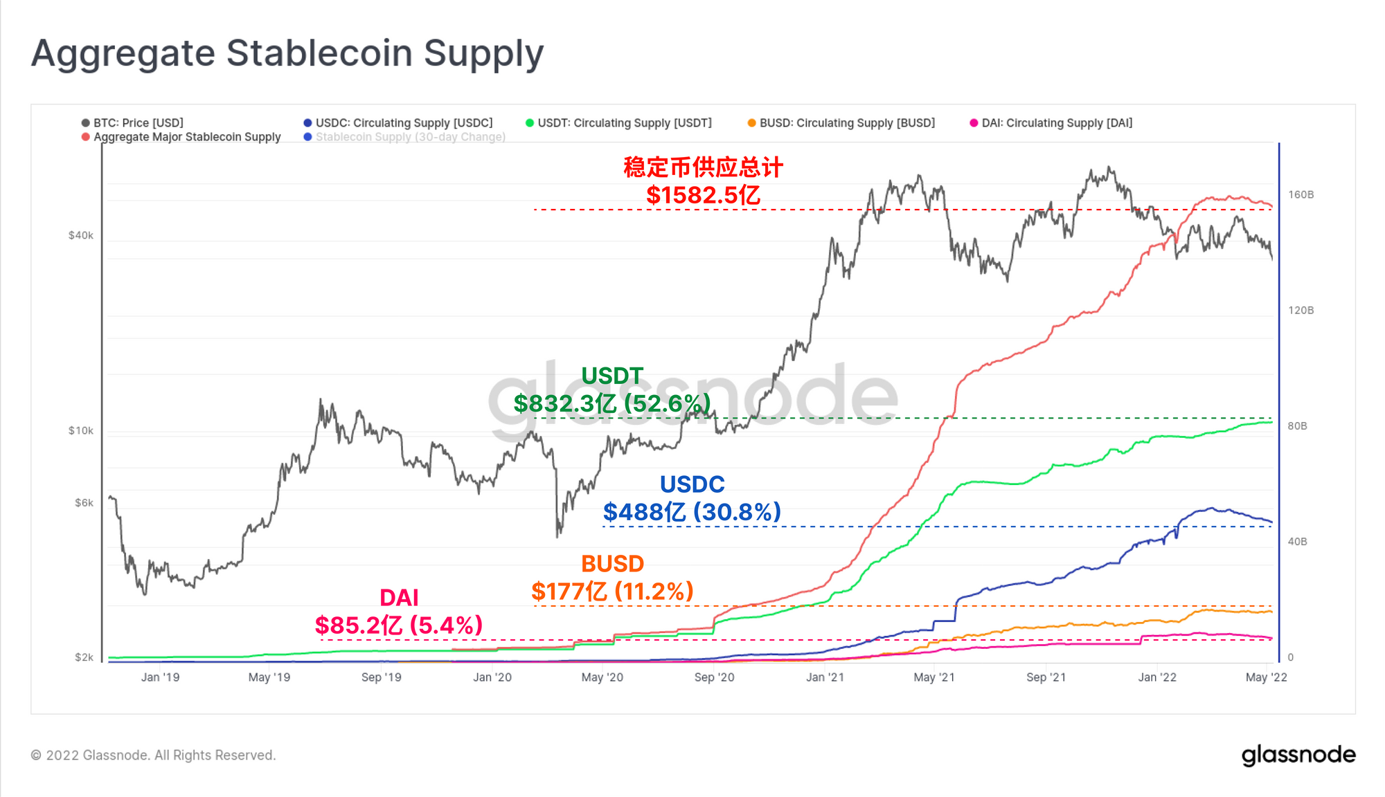 自2020年3月抛售以来,主要稳定币(USDT、USDC、BUSD和DAI)的总供应量已从53.3亿美元增加到超过1582.5亿美元。这是一个惊人的增长,在短短两年多的时间里,增长了2866%。USDT仍然是主导资产,占主要供应的52.6%,其次是USDC,占30.8%的主导地位。