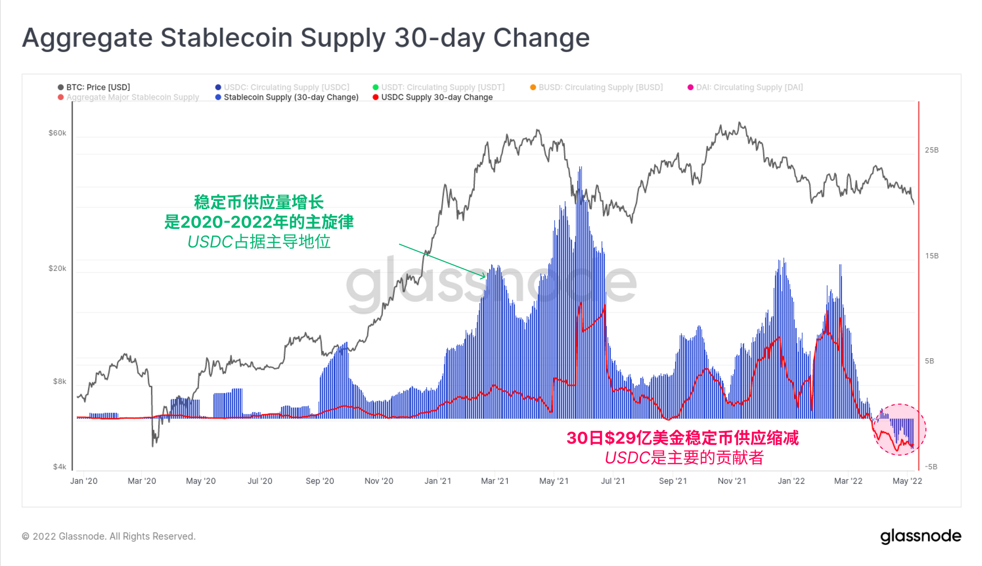 从图中可以看出,特别是自2021年5月以来,USDC一直是稳定币总供应量增长的一个主要贡献者。我们还发现,最近的这种稳定币供应收缩是一个罕见的事件,总供应收缩率达到了每月-29亿美元。USDC是正在经历赎回的主要稳定币资产,这预示着整个加密货币行业正在发生一定程度的净资本外流。