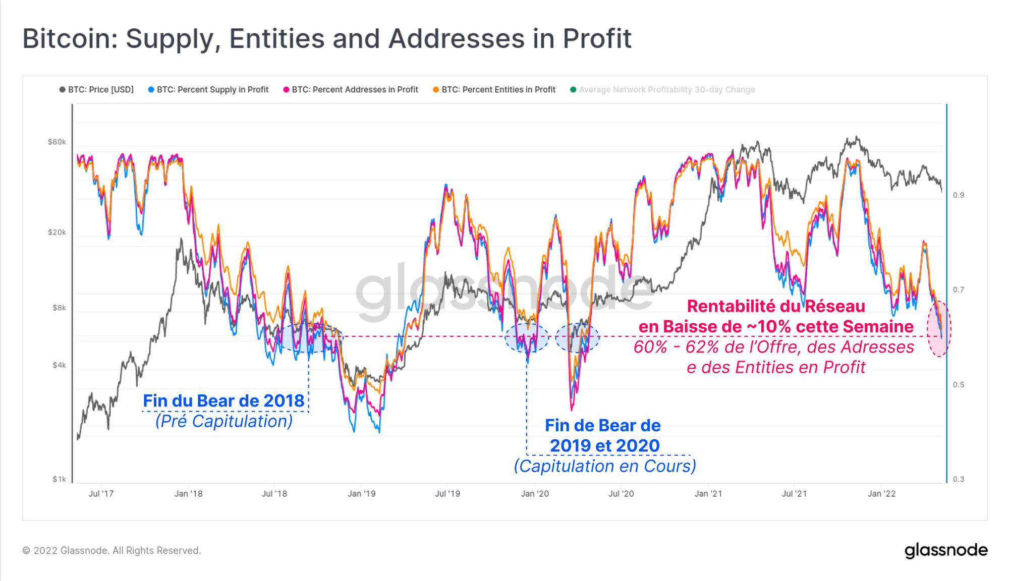 Dans cette étude de cas, nous avons estimé que les prix devraient tomber à environ $33.6k pour atteindre un « seuil de douleur » similaire à celui des marchés baissiers précédents, et faire chuter la rentabilité globale à environ 60% du réseau.
