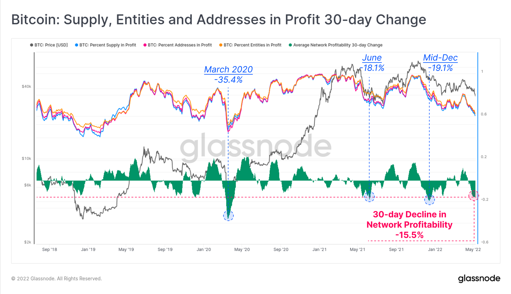 Cette baisse de rentabilité est la quatrième plus sévère sur les trois dernières années. Elle est comparée à celle de juillet et de décembre 2021, qui ont toutes deux connu des baisses de rentabilité de -18,1 % à -19,1 %. Mars 2020 reste le plus important de l'histoire récente, avec -35,4% du réseau Bitcoin tombant dans le rouge en quelques jours seulement.
