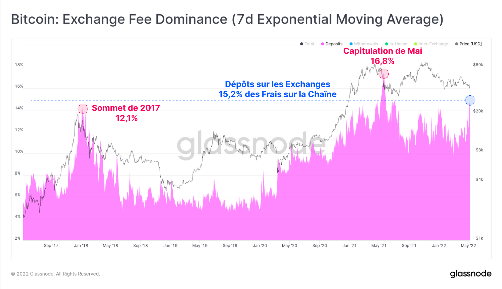15,2 % de tous les frais de transaction on-chain payés étaient associés à des transactions de dépôt, ce qui est plus élevé qu'à l'apogée du bull-run de 2017 (12,1 %) et est seulement dépassé par la capitulation de mai 2021 (16,8 %).