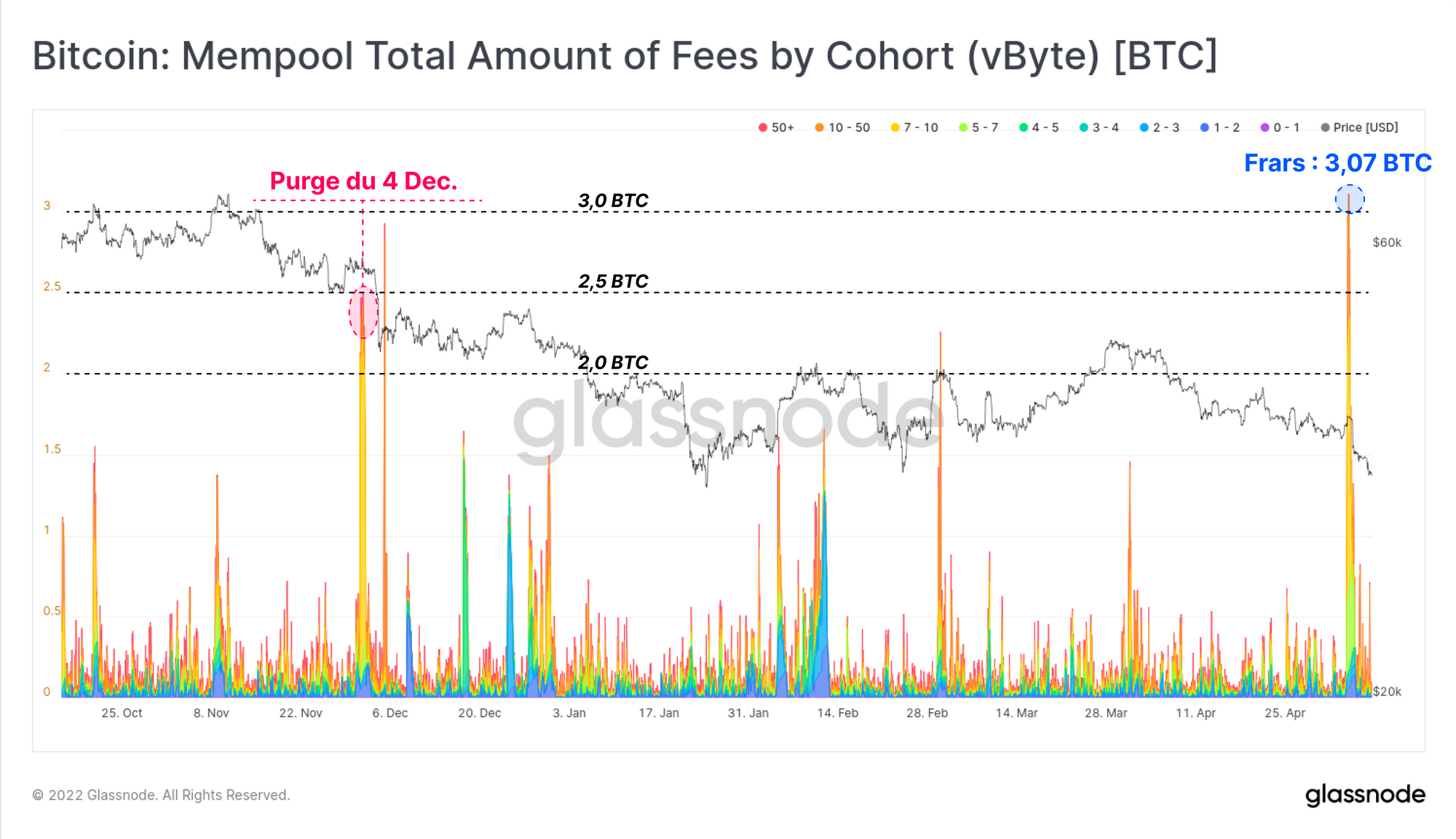 Nous pouvons également constater qu'un degré élevé d'urgence était associé à ces transactions, puisque la valeur totale de tous les frais de transaction on-chain payés a atteint 3,07 BTC.