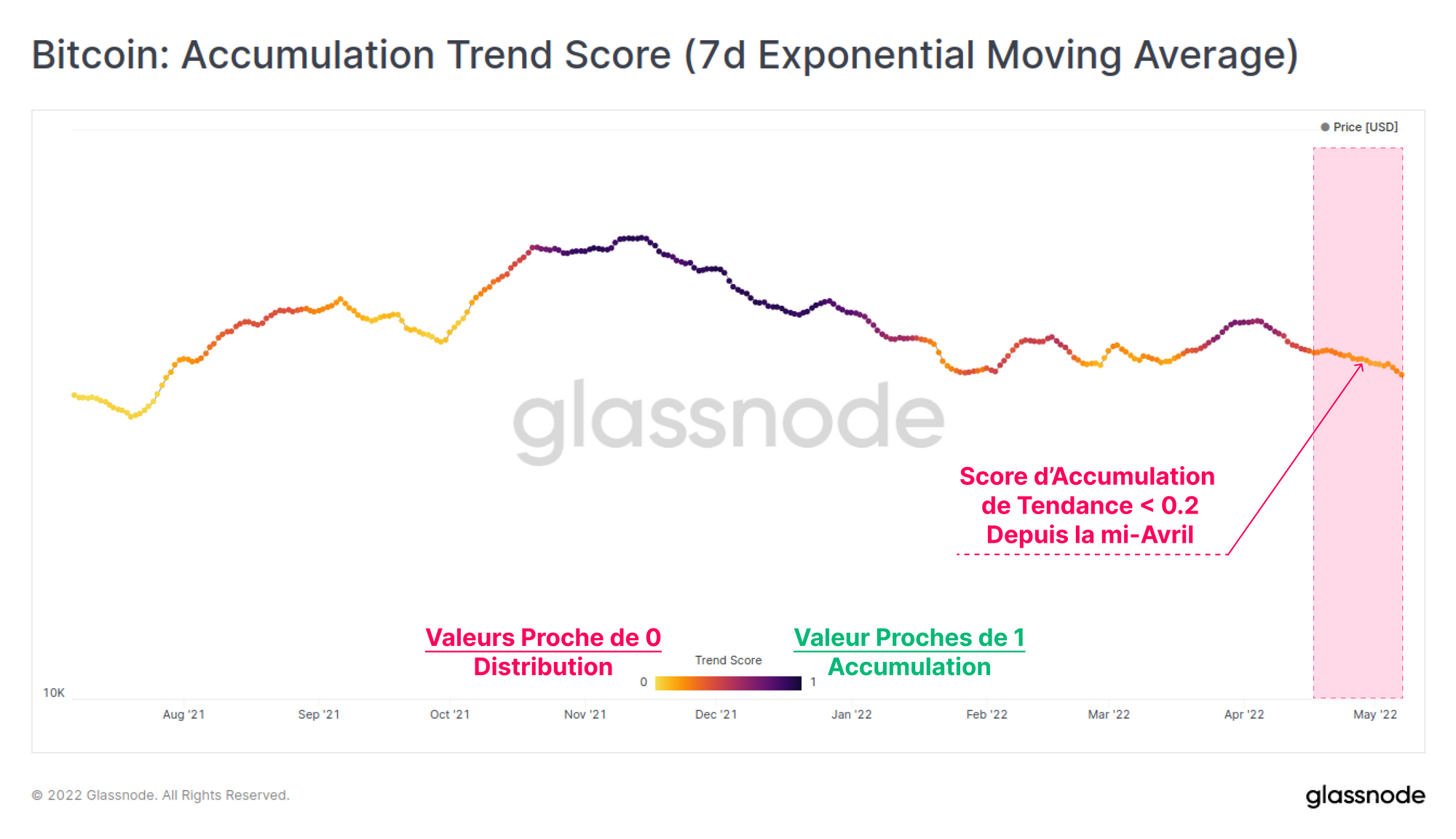 L'indicateur du score de tendance de l'accumulation a connu un mois nettement plus calme, avec des valeurs inférieures à 0,2 depuis la mi-avril. Cela indique généralement un comportement plus distributif et coïncide avec des prix de marché plus faibles.