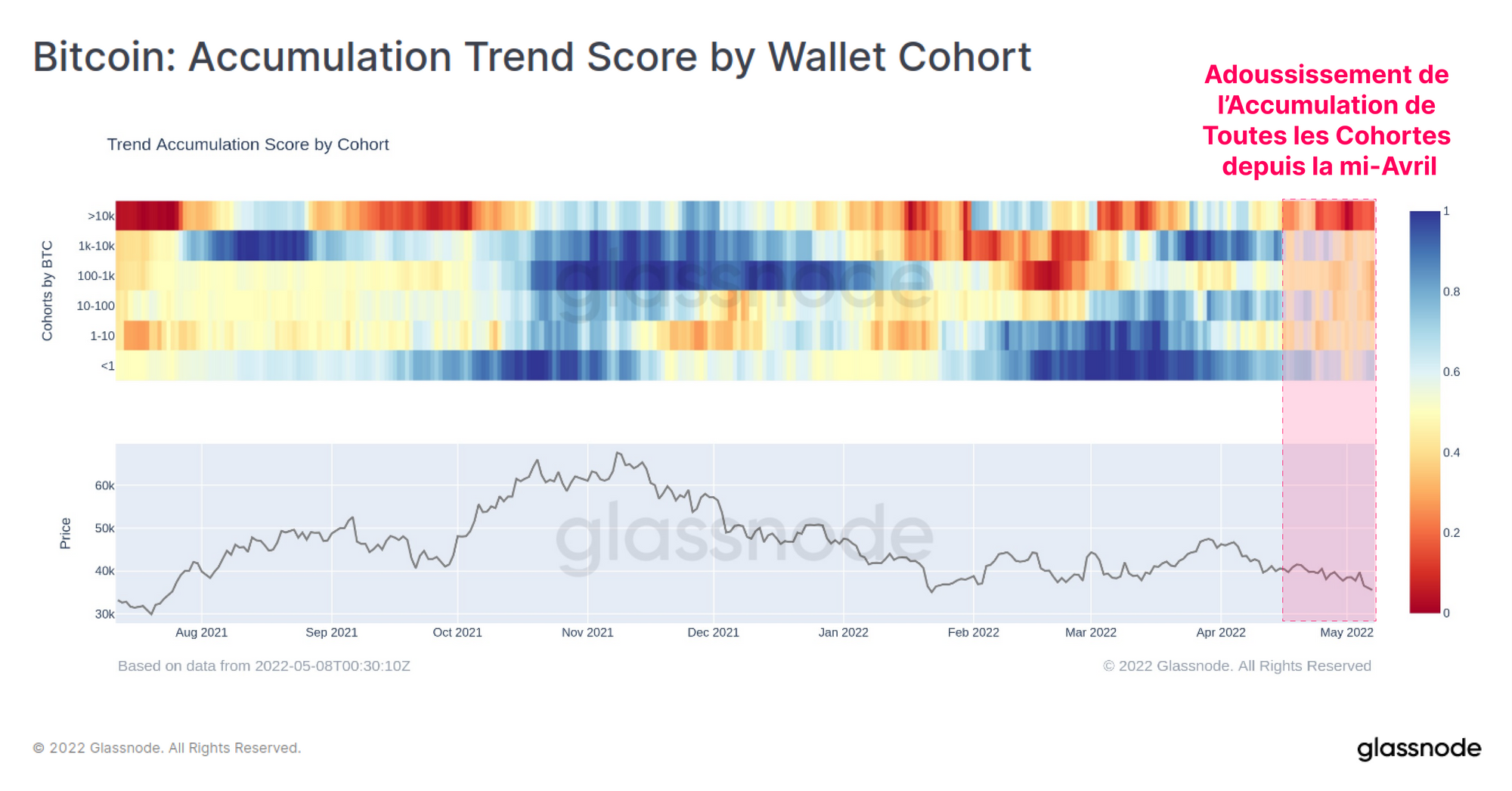 Les très grandes entités avec des soldes > 10k ont été une force distributrice particulièrement importante au cours des dernières semaines. Les plus petits investisseurs (< 1BTC) sont les plus forts accumulateurs, mais leur accumulation est nettement plus faible qu'en février et mars.