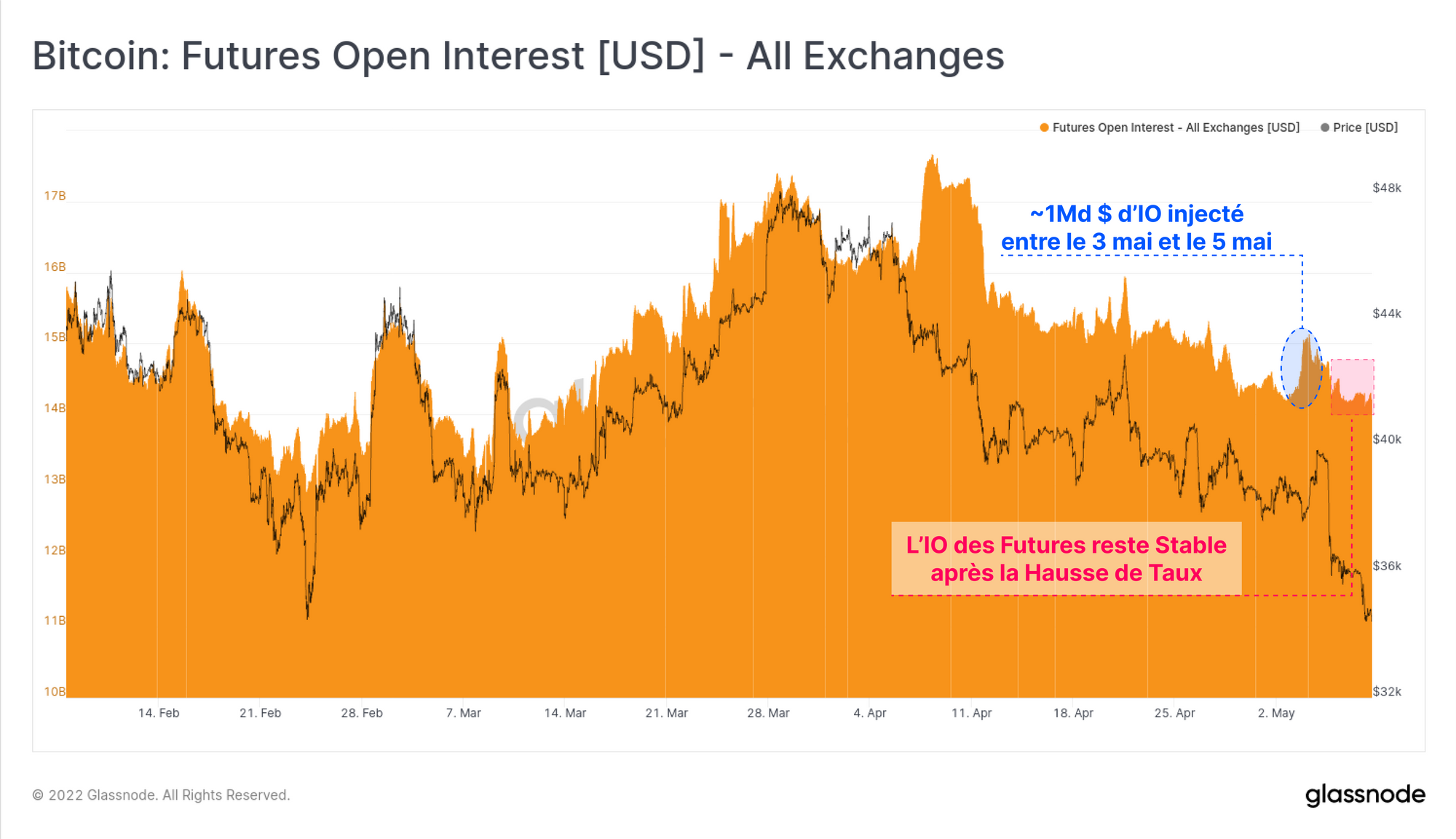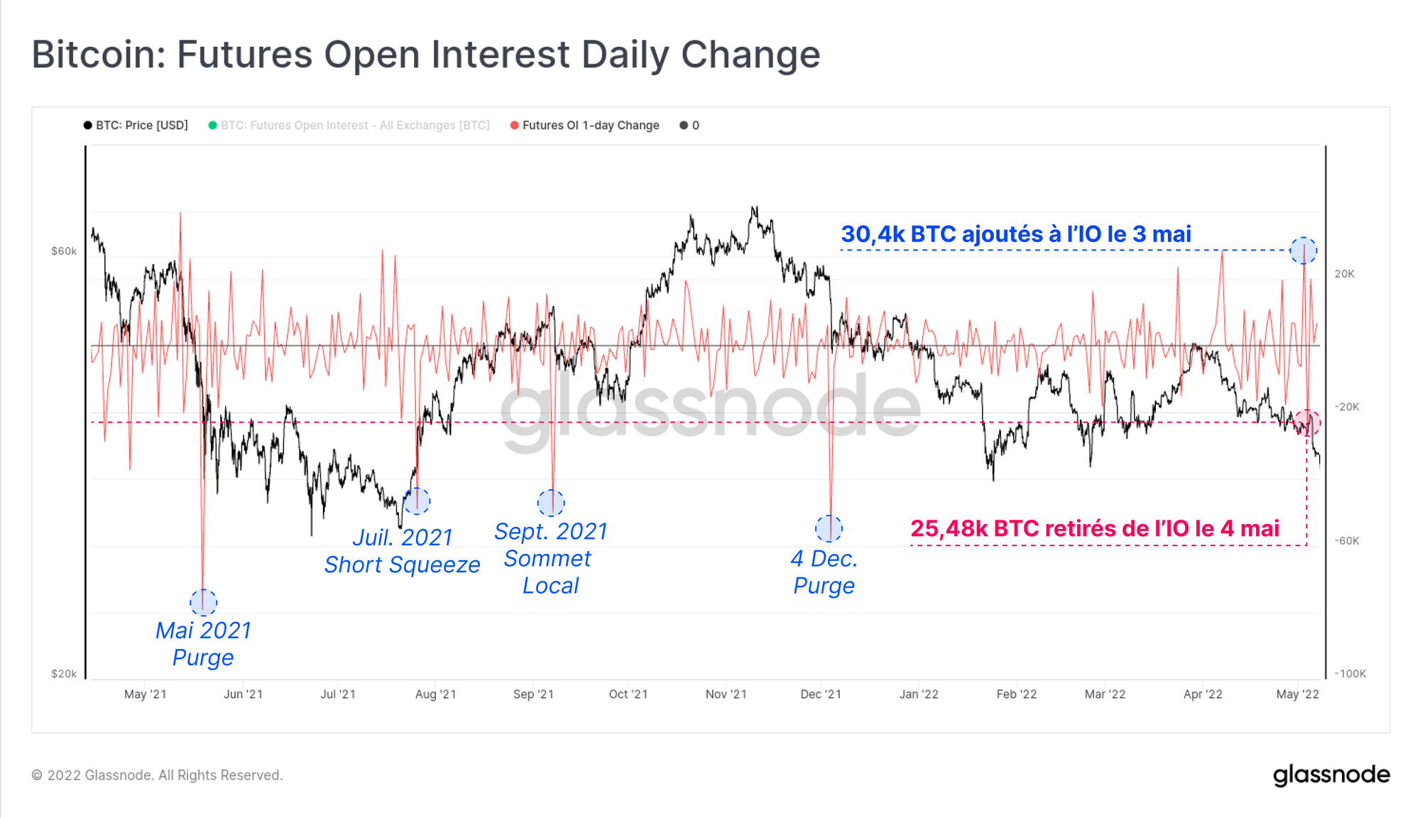 Nous pouvons voir l'action initiale qui a précédé l'annonce de la Fed dans la variation quoitidienne de l'intérêt ouvert (IO) des contrats à terme. L'IO a augmenté d'un total de 30,4k BTC le 3 mai, avant que 25,48k BTC ne soient retirés le jour suivant.