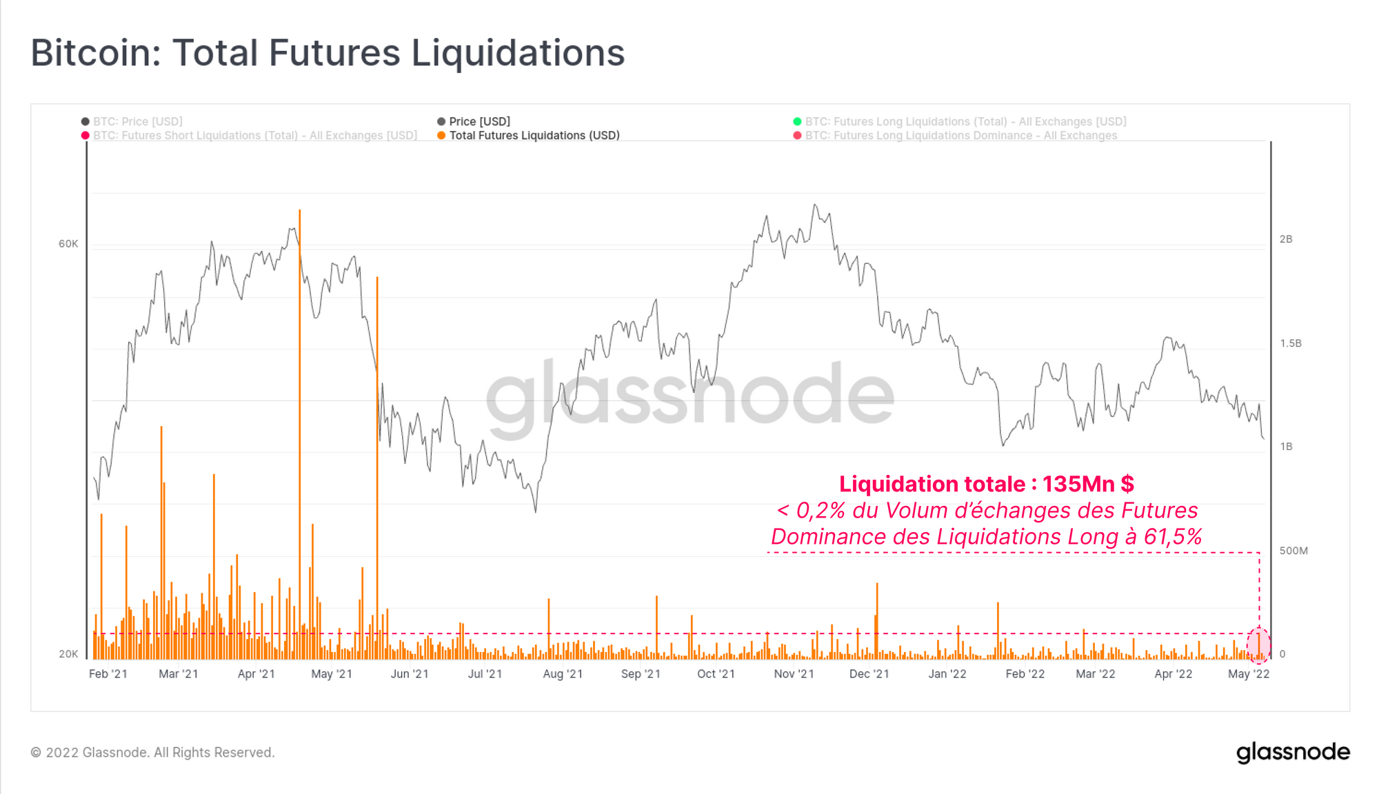 Cependant, cette semaine, au plus fort de la liquidation, une valeur maximale de 135 millions de dollars de positions à terme a été liquidée. Cela représente moins de 0,2 % du volume de contrats à terme négociés.