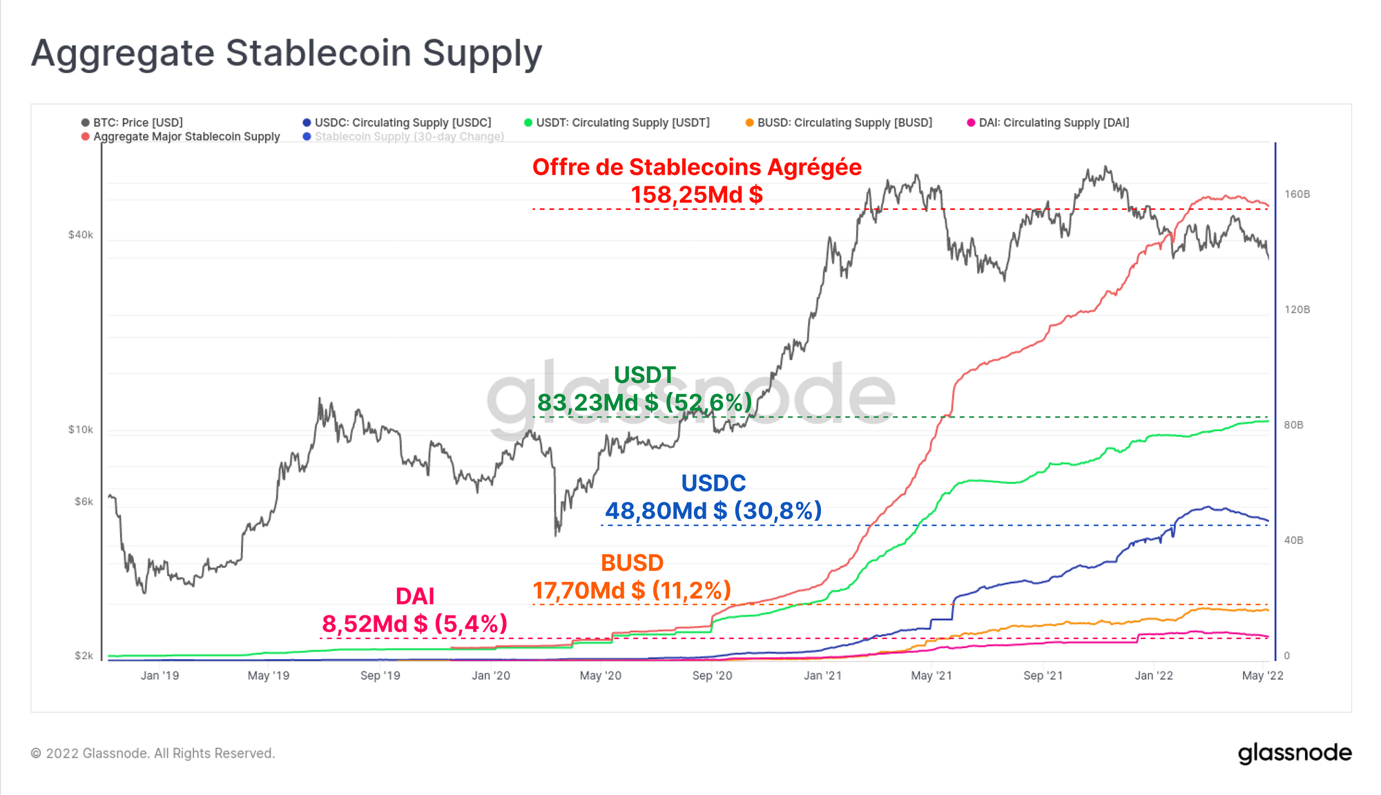 Depuis la liquidation de mars 2020, l'offre globale des principaux stablecoins (USDT, USDC, BUSD et DAI) est passée de 5,33 milliards de dollars à plus de 158,25 milliards de dollars. Il s'agit d'une croissance de 2 866 % en un peu plus de deux ans. L'USDT reste l'actif dominant, représentant 52,6 % de l'offre et est suivi par l'USDC avec une dominanc de 30,8 %.