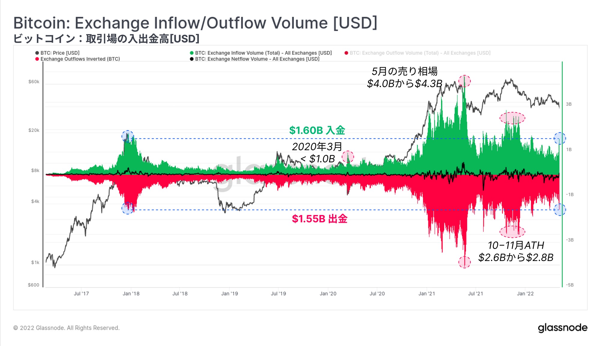 どのような日でも、大量のBTCが取引所に流入し、また取引所から流出している。7億5000万ドル(流入出合計15億ドル以上)を大きく超える取引所フローは、2021-22年の市場サイクルにおいて典型的な下限となっている。