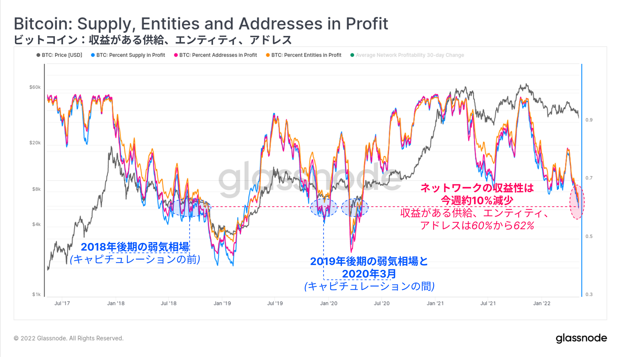 今回は、まずネットワークの収益性の状況を評価し、先週提案した「弱気市場における痛みの閾値」のケーススタディと比較して、どのように変化したかを確認する。次に、全体的な視点から、最近の価格低迷に対する市場の反応を、様々な市場セクターで観察する: