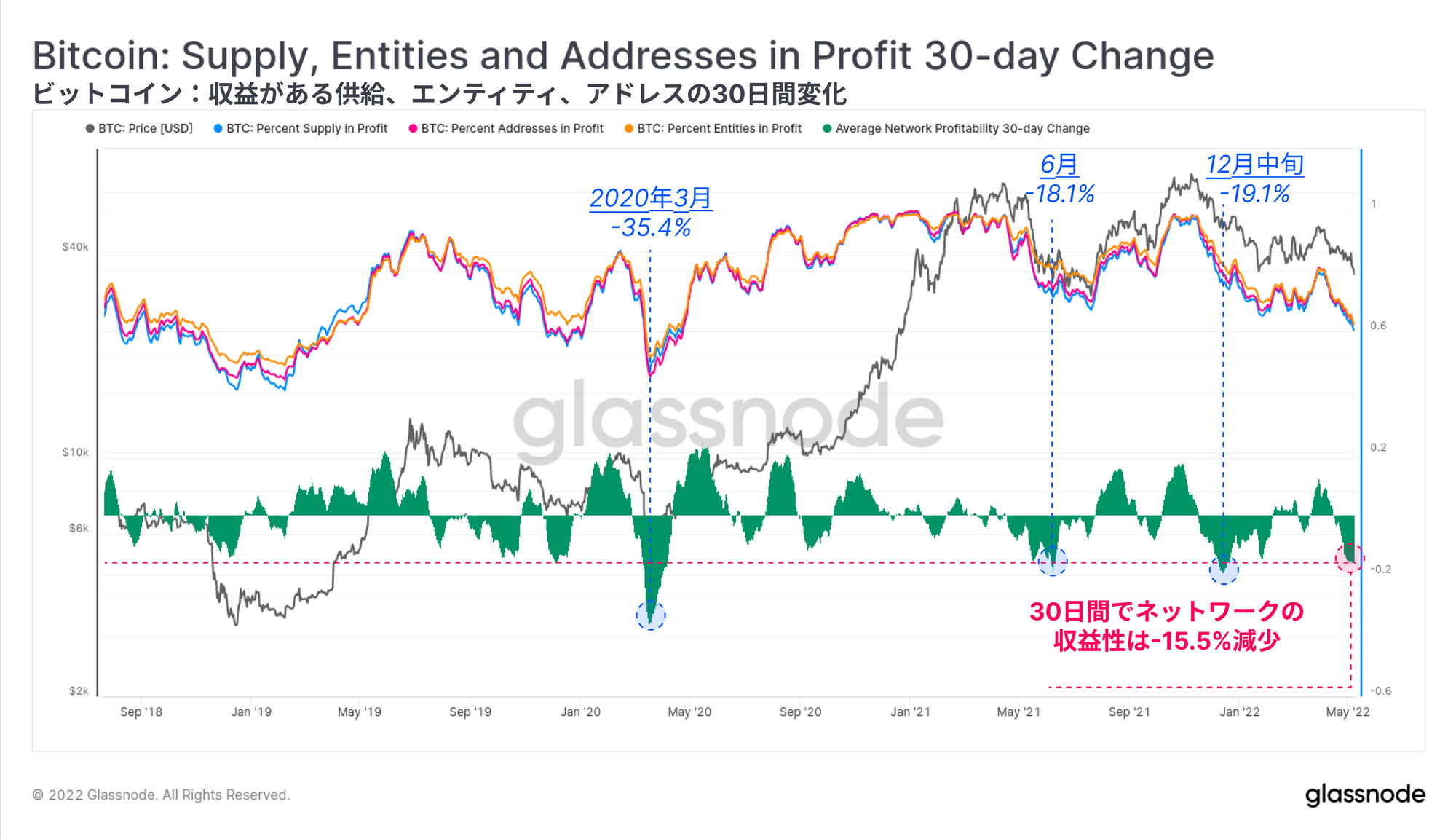 この収益性の低下は、過去3年間で4番目に深刻なものである。これは、2021年7月と12月と比較すると、いずれも収益性の低下が-18.1%~-19.1%であった。2020年3月は、わずか数日間でビットコインネットワークの-35.4%が含み損に陥り、最近の歴史の中でも最も大きなものであることに変わりはない。