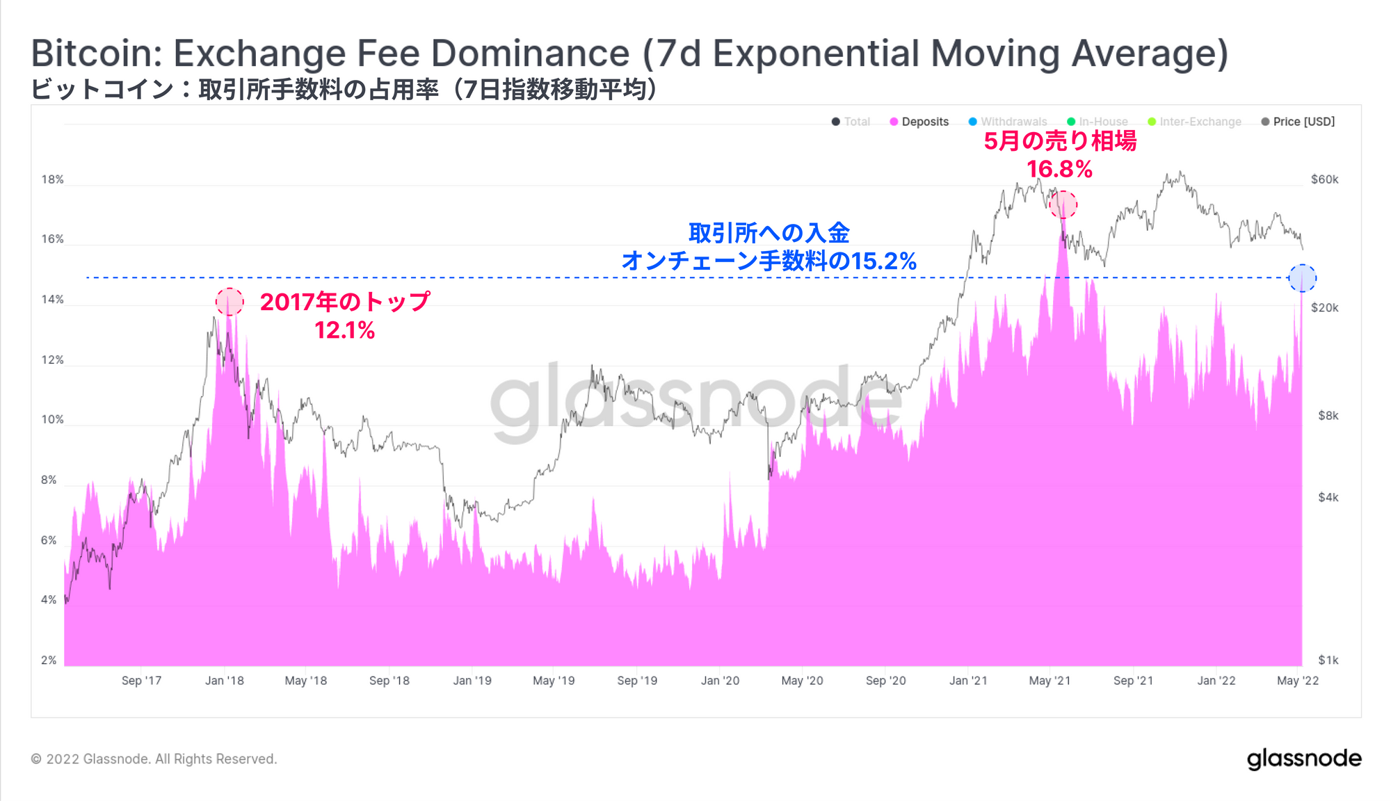 支払われた全オンチェーン取引手数料の15.2%が取引所への流入取引に関連しており、これは2017年の強気相場のトップ時点(12.1%)よりも高く、2021年5月の売り相場(16.8%)にのみ抜かれている。