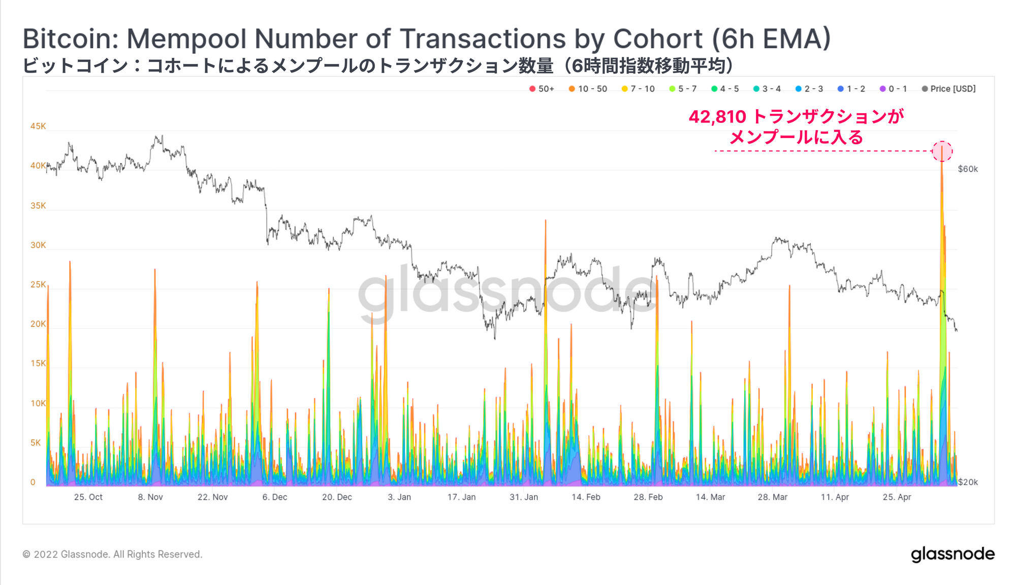 ボラティリティや市場のストレスが高い時期には、投資家がリスク回避や売却、またはマージンポジションの再担保を求めて、ビットコインメンプールに「緊急」トランザクションが流入することが一般的である。今週は市場が売り相場となるなか、ビットコインメンプールに42.8kのトランザクションが殺到したことが確認された。これは、2021年10月中旬(私たちがメンプール活動の追跡を開始した時)以来、取引活動における最も多い流入である。