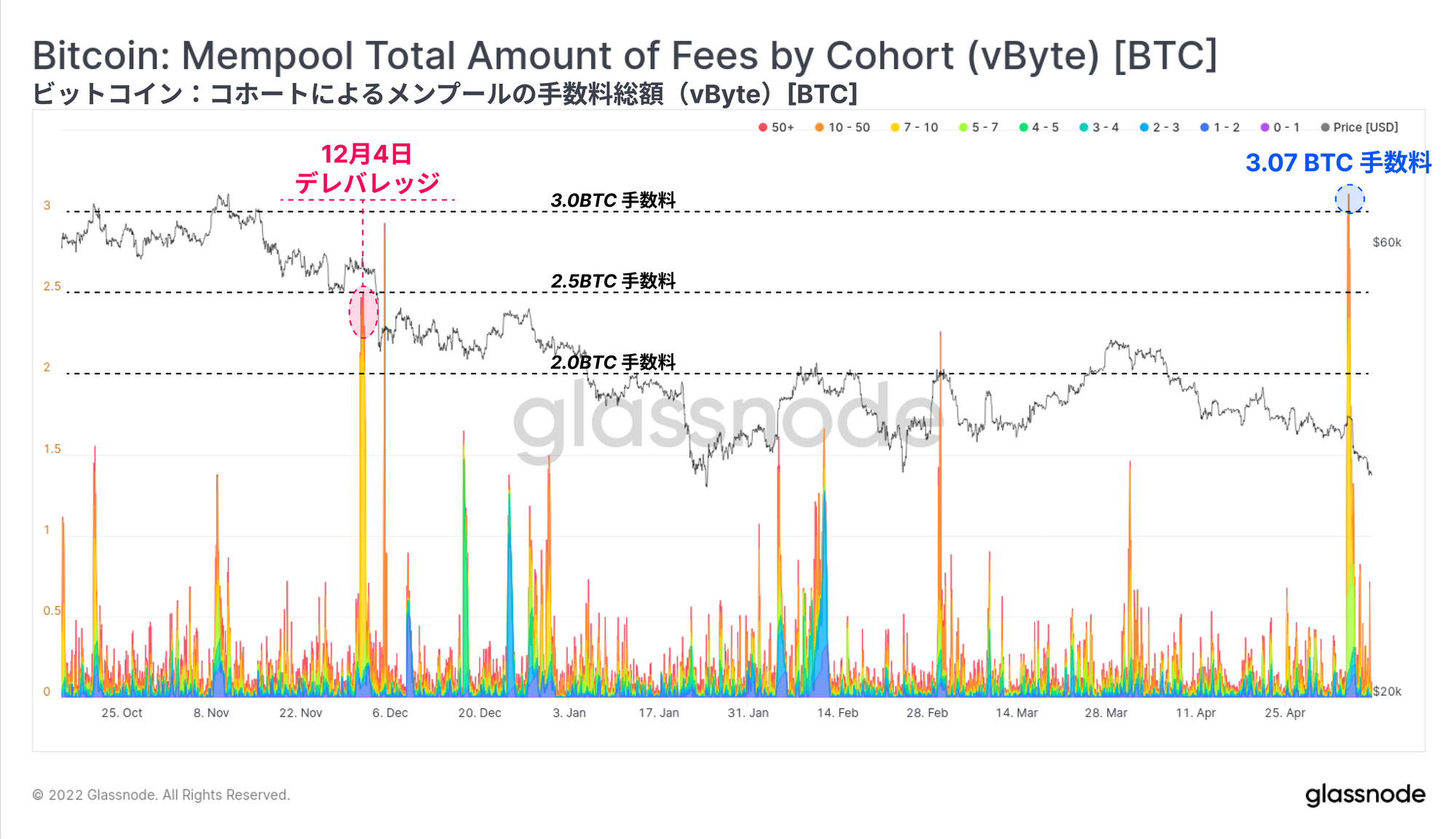 また、支払われたすべてのオンチェーン取引手数料の合計値が3.07BTCに達したことから、関連するこれらの取引には高い緊急性があったことがわかる。これは、12月4日のデレバレッジイベントの際、1日で市場が-34.5%下落した時(2021年第49週で取り上げた)よりも高く、また、これまでのデータセットの中で最高値となっている。