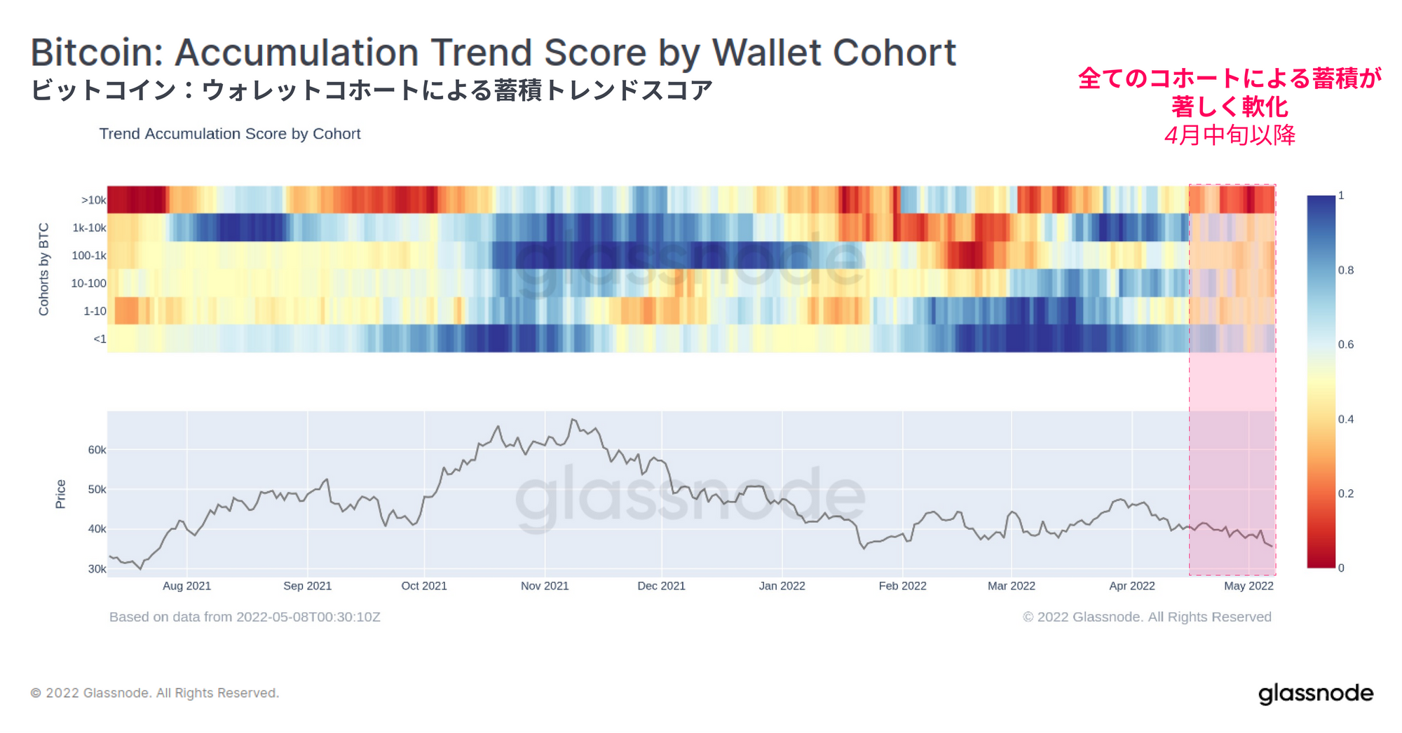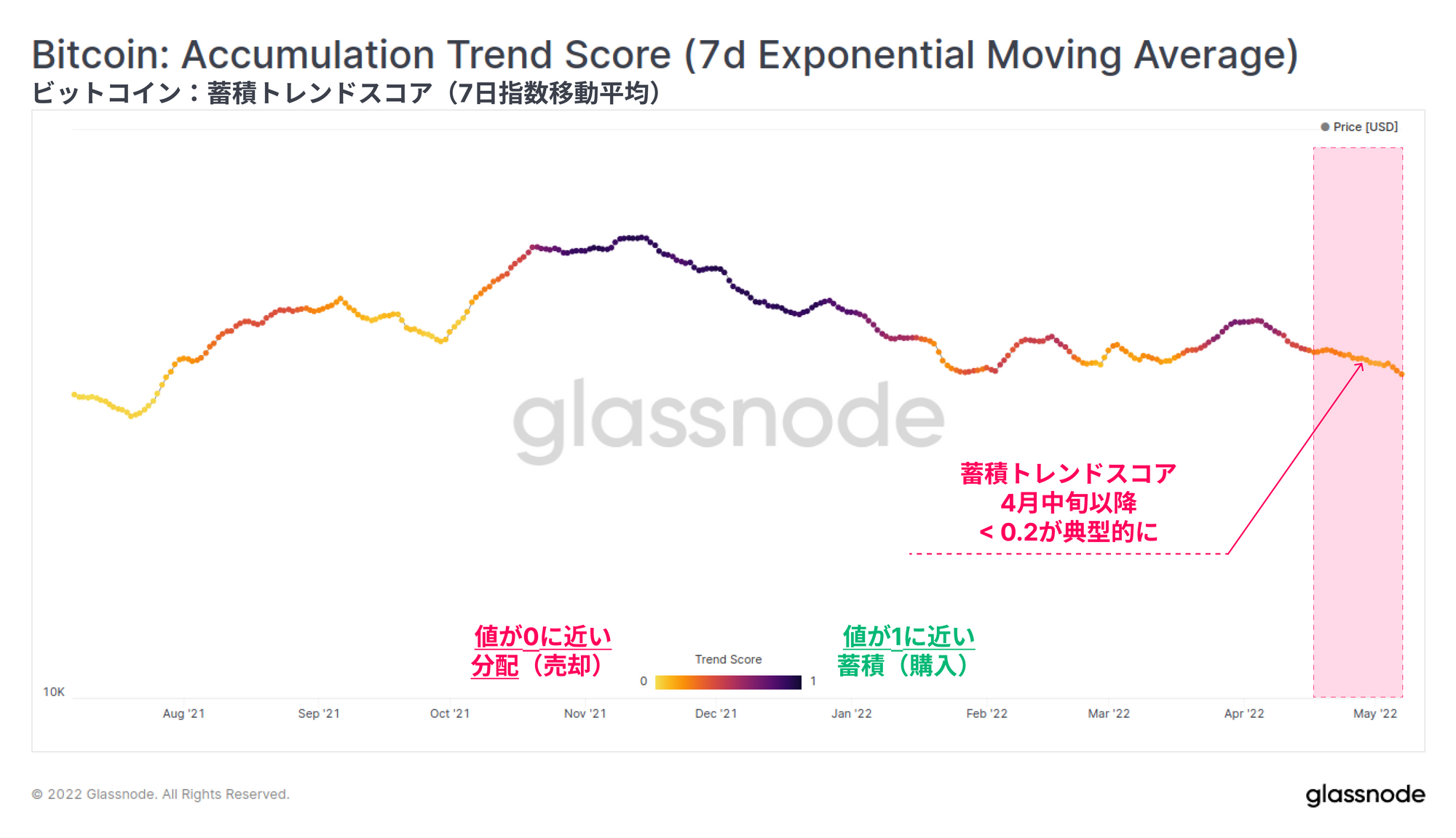 ビットコイン蓄積トレンドスコア指標は、4月中旬以降は0.2未満の値であり、著しく軟調に推移している。これは一般的に、より分配的な行為(売却行為)を示しており、蓄積も減少し、市場価格の弱含みと一致している。