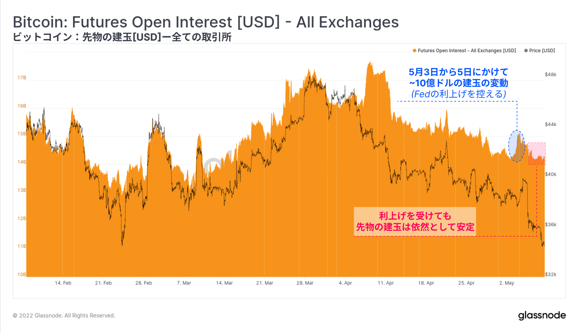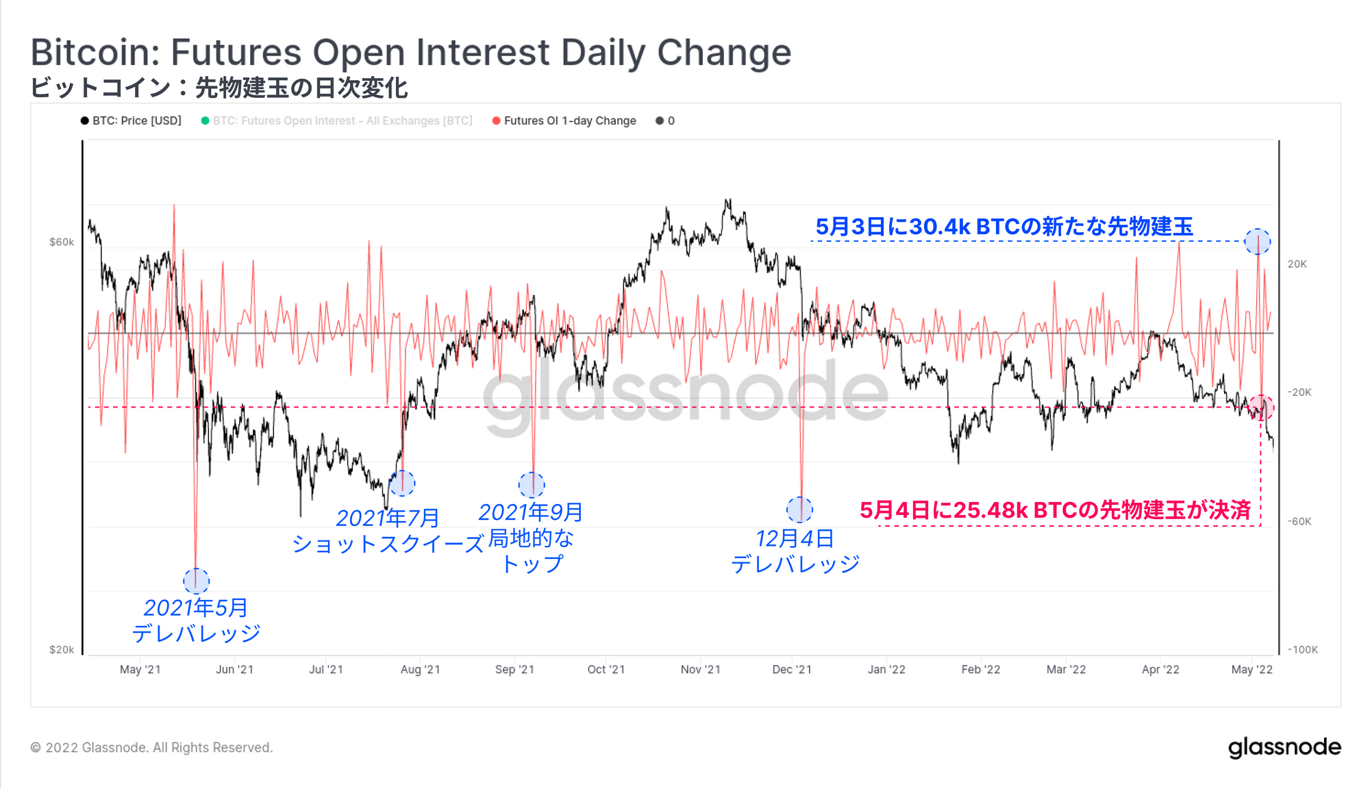 FRB(連邦準備制度理事会)の発表に至るまでの最初の波状行為は、先物建玉の1日の変化で見える。5月3日に建玉は合計30.4kBTC増加し、翌日には25.48kBTCが決済された。