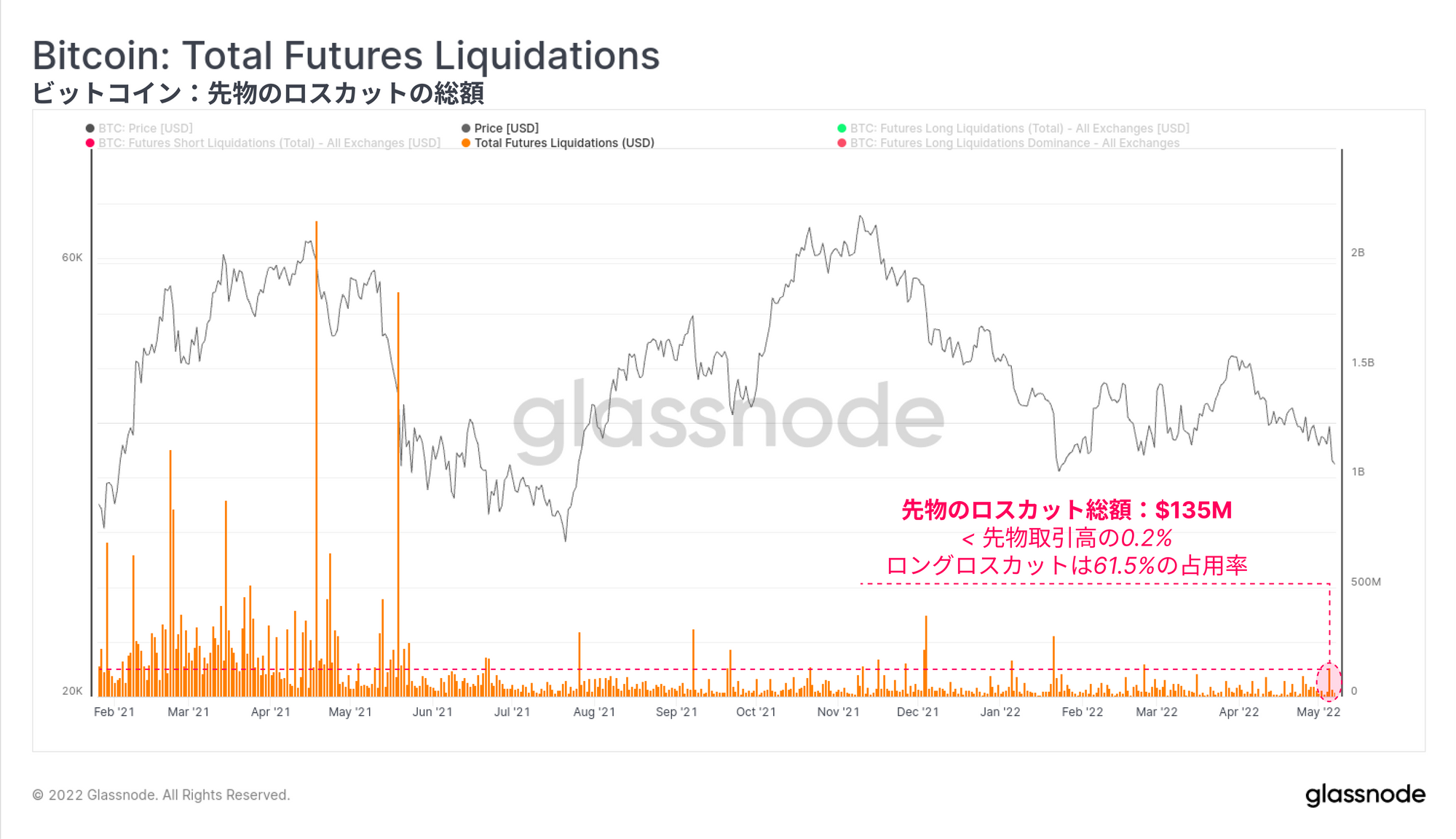 先物市場で発生したロスカットの総額を見れば、この評価に対してさらに確信を持つことができる。一般的に、先物市場のデレバレッジイベントでは、ロスカットによって強制決済されるポジションが相対的に多くなることが予想される。