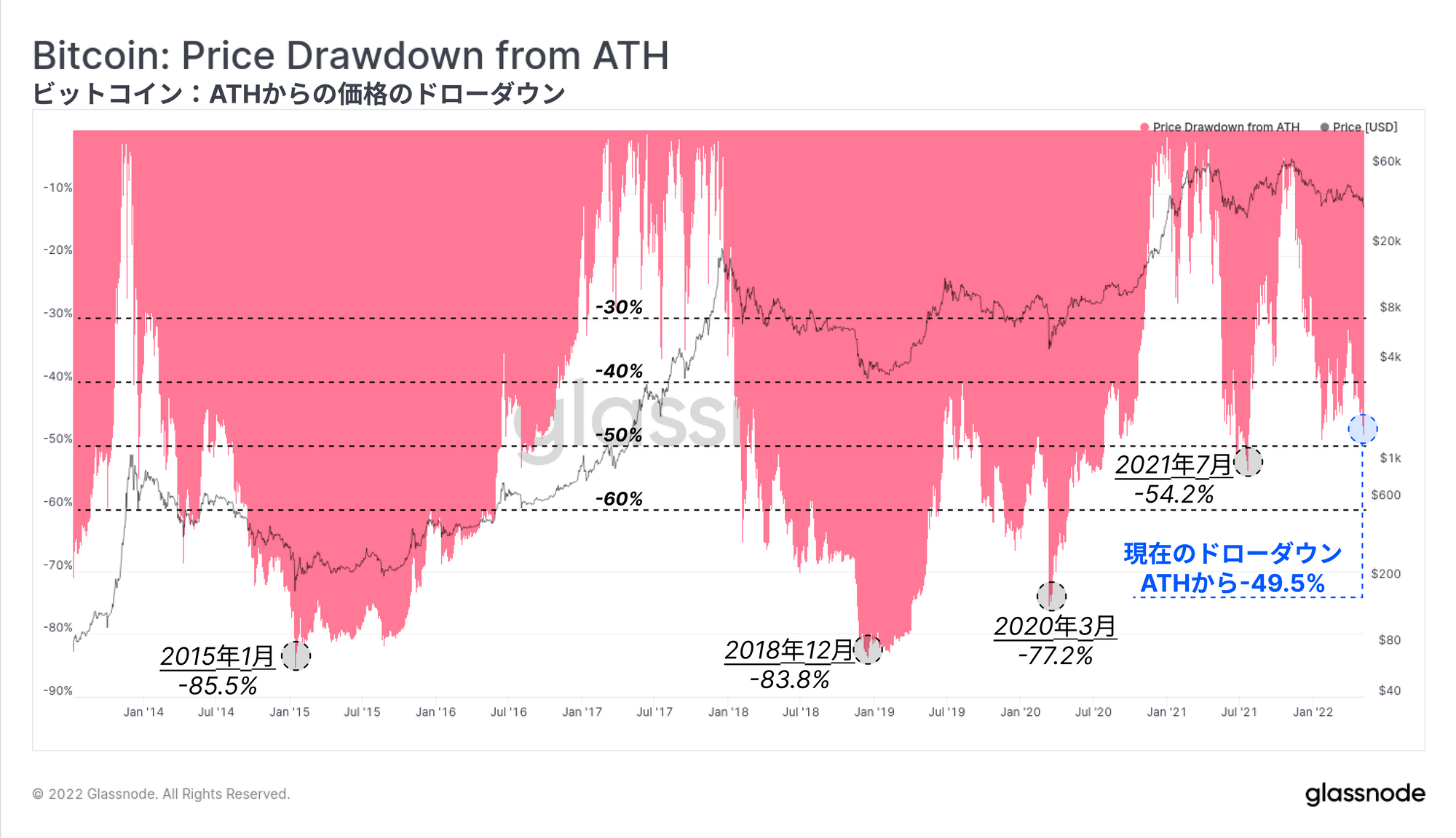 これは大幅なドローダウンであるが、過去のビットコインの弱気相場における最終的な安値と比較すると、まだ控えめである。2021年7月のドローダウンでは-54.2%に達し、2015年、2018年、2020年3月の弱気相場はATHから-77.2%と-85.5%の間の安値でキャピチュレーションが起こった。