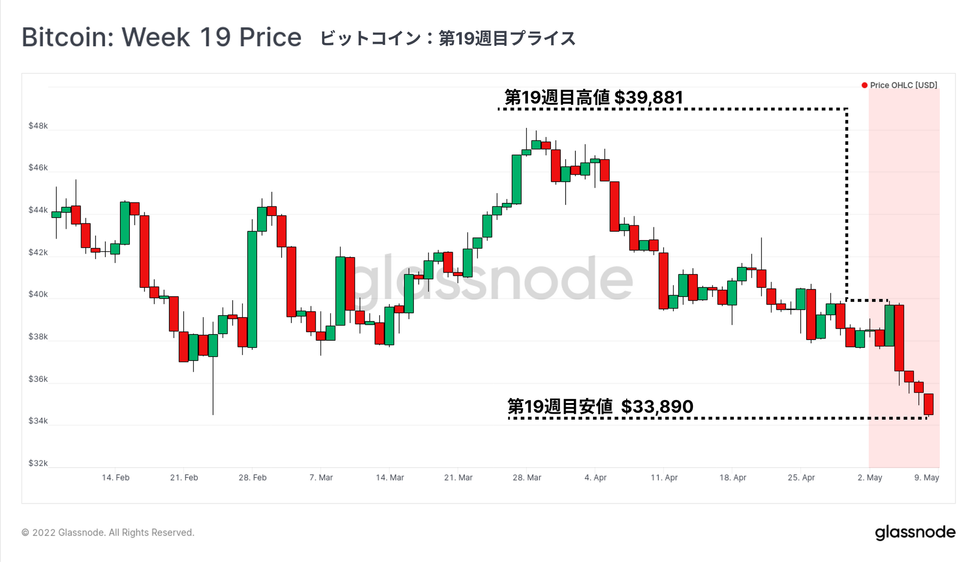 今週、市場はFRB(連邦準備制度理事会)による0.5%の利上げ決定に反応し、高いボラティリティとさらなる下落を経験した。市場は当初このニュースに好反応を示し、水曜日にビットコインは週高値の39,881ドルまで上昇した。しかし、ポジティブな勢いはすぐに終わり、木曜日に市場は大幅に売ったことでビットコインは-13.8%下落、33,890ドルで週を終えた。