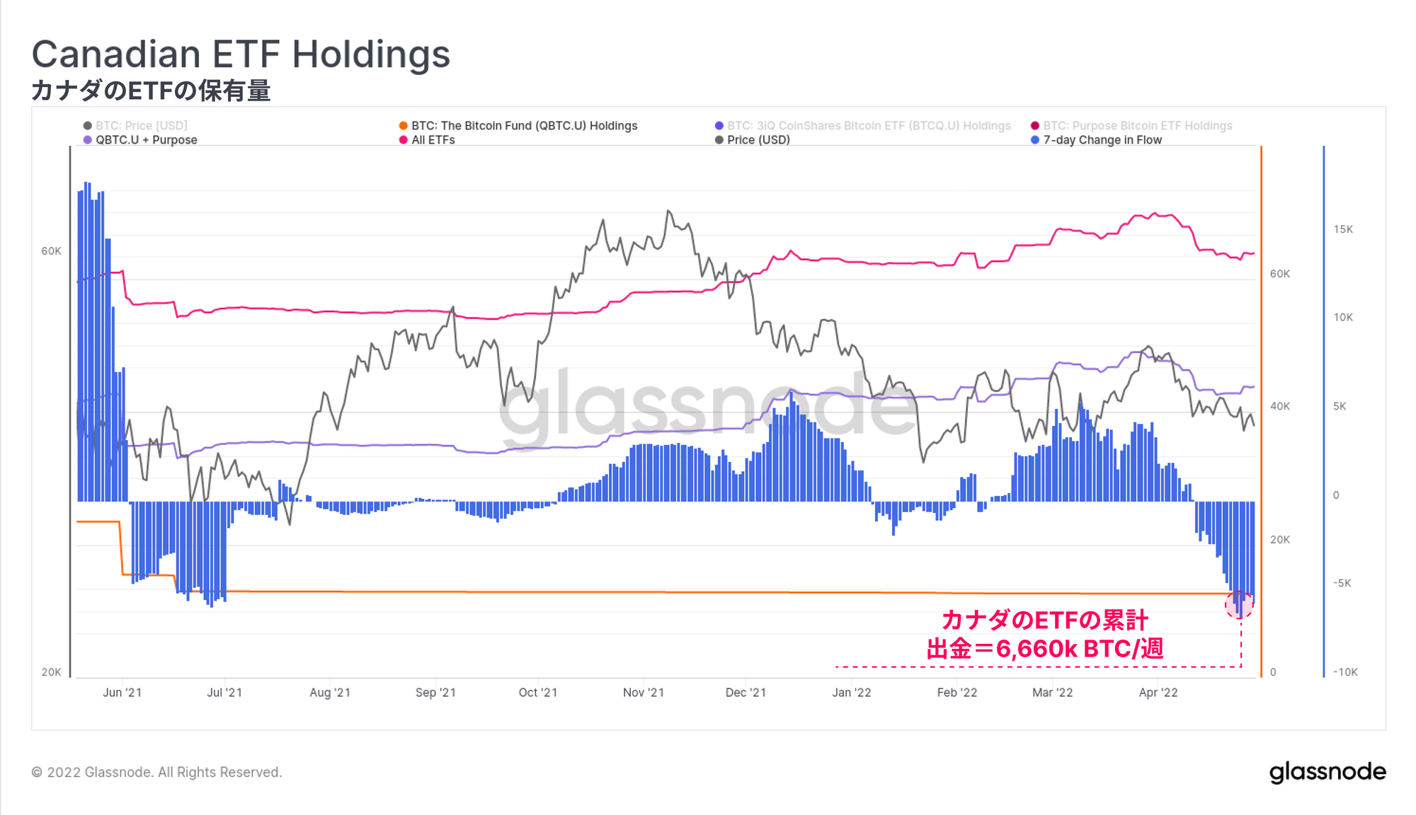 7日間の変化で見ると、1週間あたり6.66万BTCがこれらの商品から流出しており、これは最近の価格の弱さに大きく反応している。