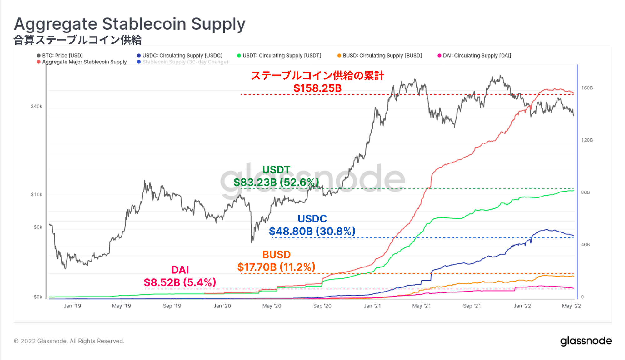 2020年3月の売り相場以降、主要なステーブルコイン(USDT、USDC、BUSD、DAI)の供給総額は5.33Bドルから158.25Bドル超まで増加した。これは、わずか2年余りで2,866%という驚異的な成長である。USDTは主要供給量の52.6%を占め、USDCが30.8%の占有率で第二位となっている。